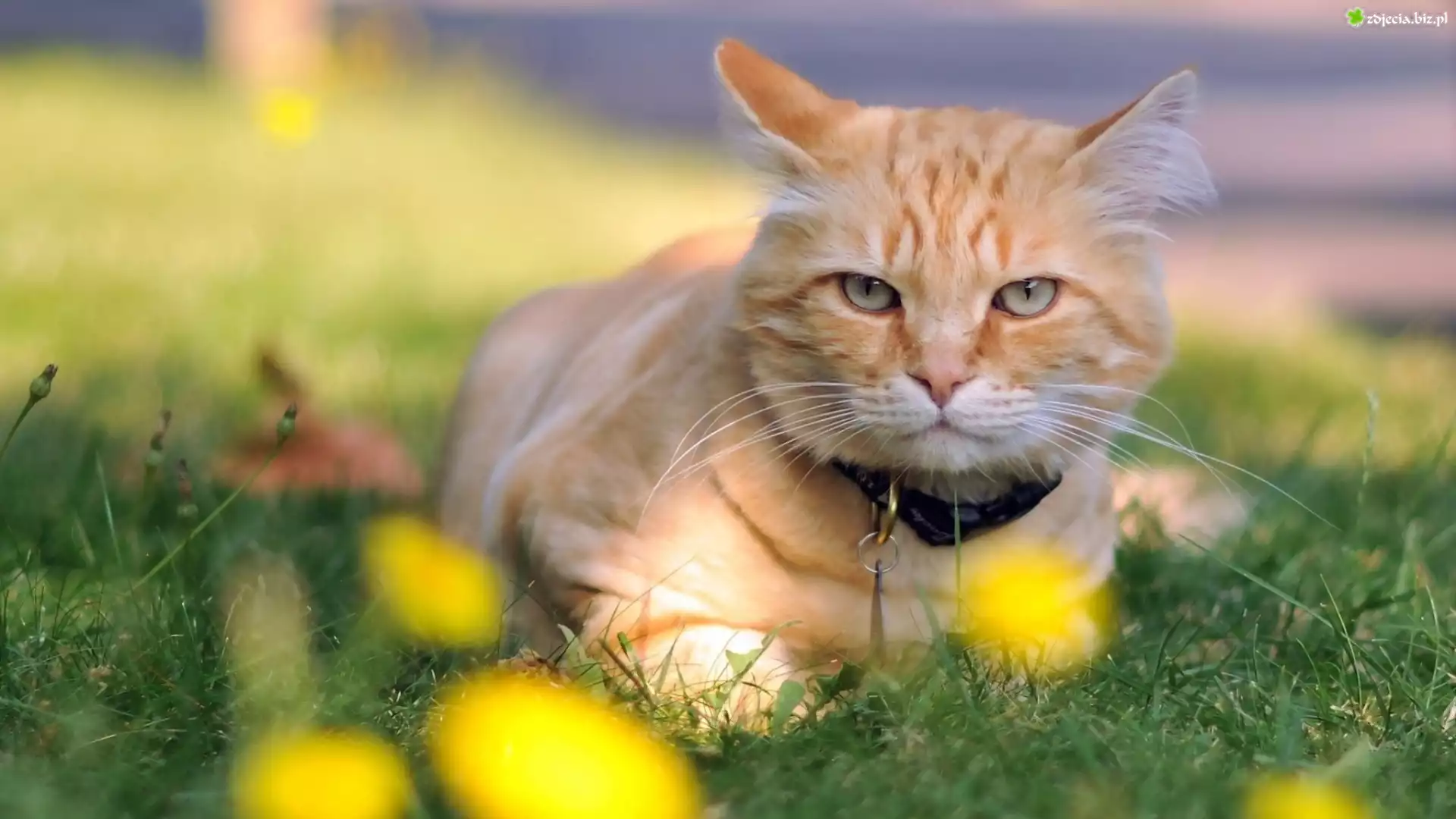 Zdjęcie Rudy, Kot, Łąka, Trawa, Żółte, Kwiaty, Obroża