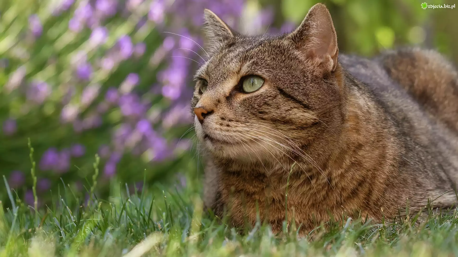 Zdjęcie Leżący, Szaro-bury, Kot, Trawa, Zbliżenie