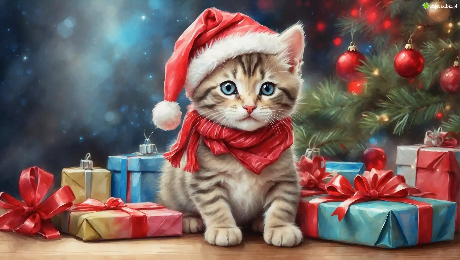 Zdjęcie Boże narodzenie, Świąteczne, Kotek, Prezenty, Choinka