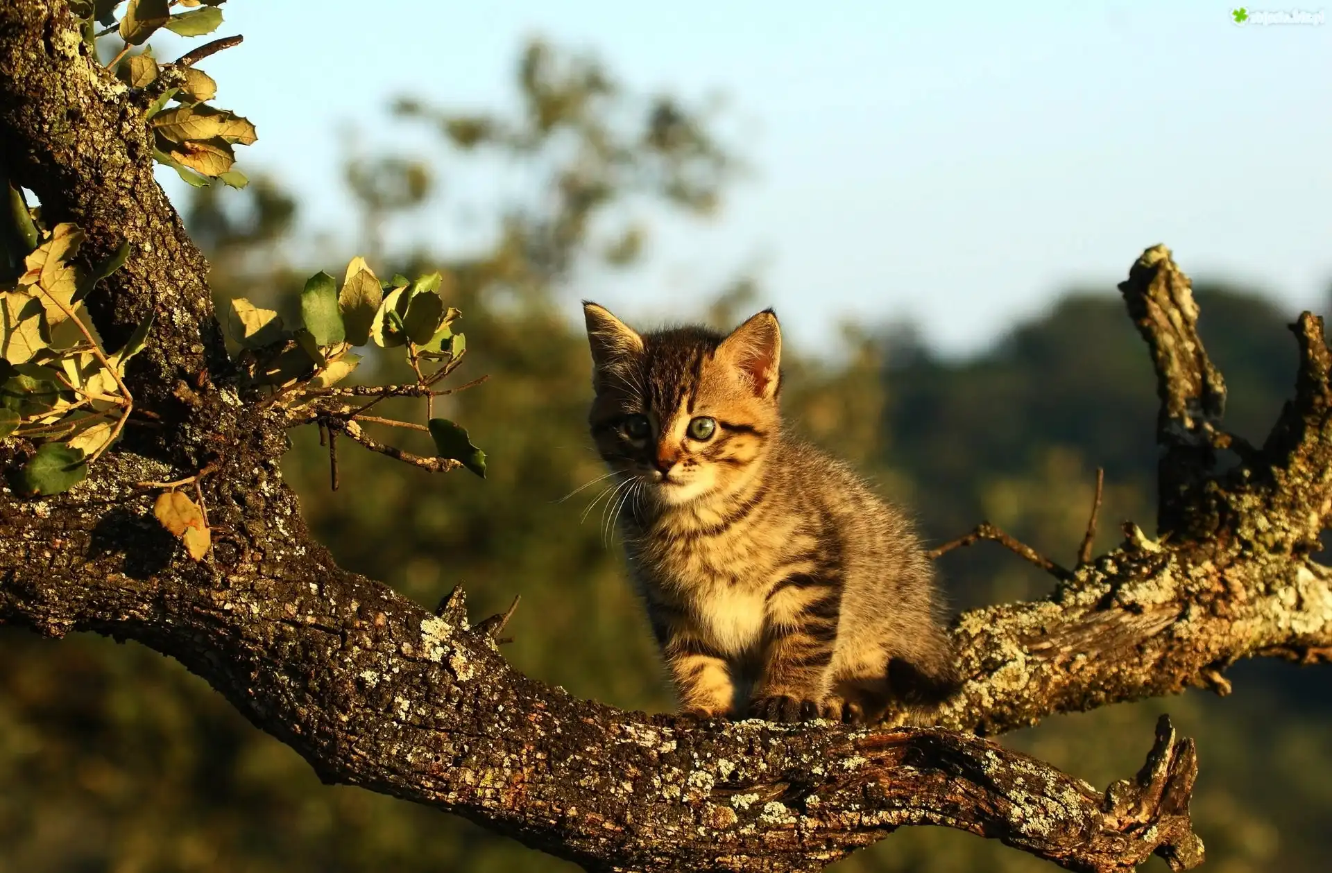 Zdjęcie, Kotek, Konar, Zachód Słońca