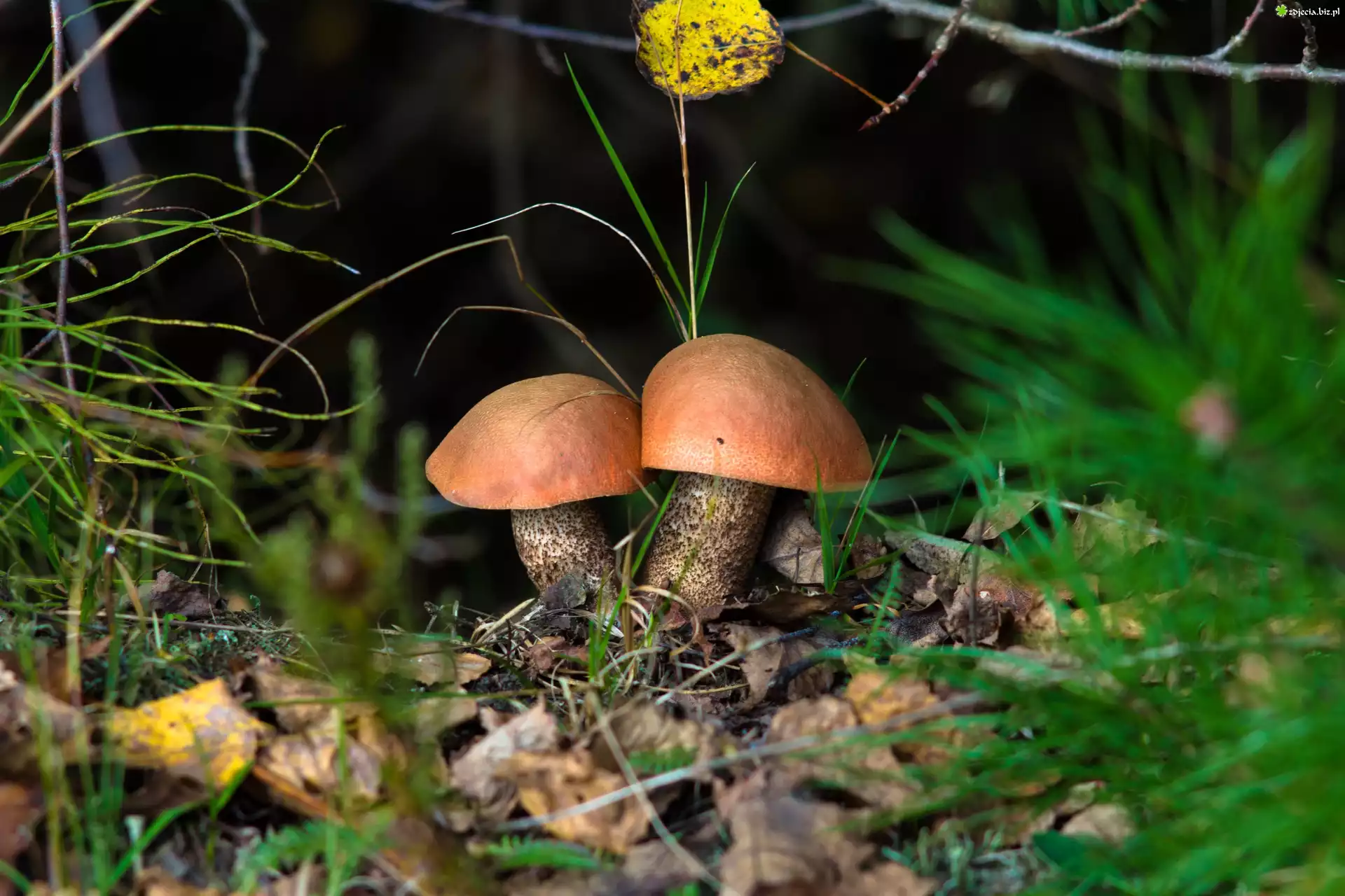 Zdjęcie, Koźlarze czerwone, Dwa, Grzyby, Trawa, Liście
