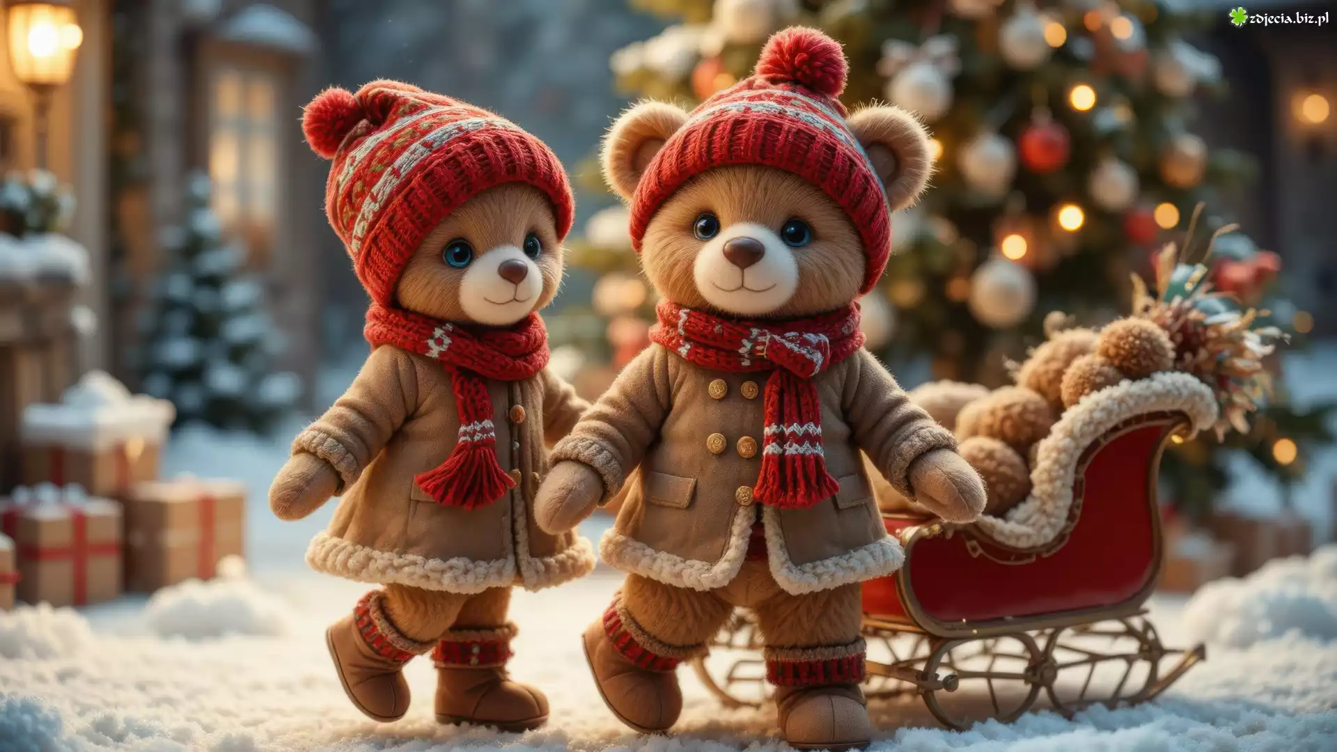 Zdjęcie Dwa, Misie, Czapki, Kożuszki, Sanki, Choinka