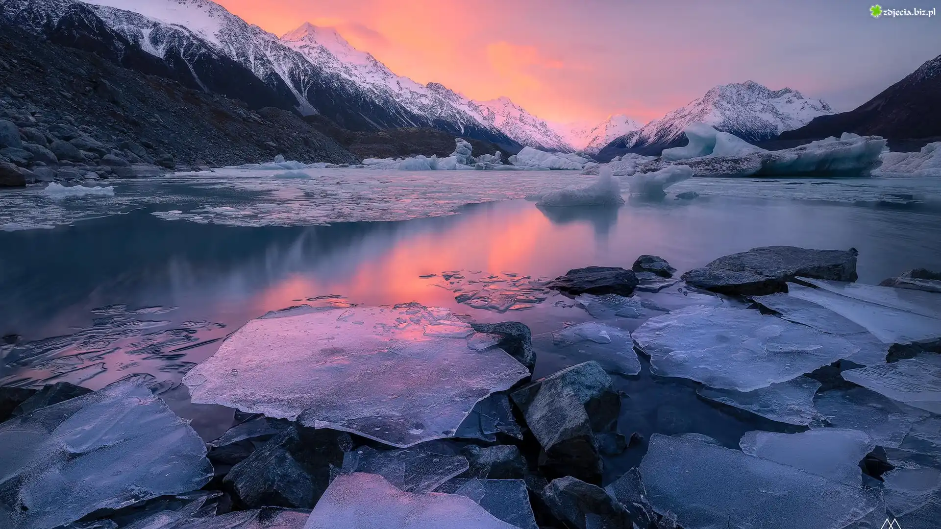 Zdjęcie, Jezioro Tasmana, Zima, Kra, Park Narodowy Góry Cooka, Góry, Alpy Południowe, Nowa Zelandia