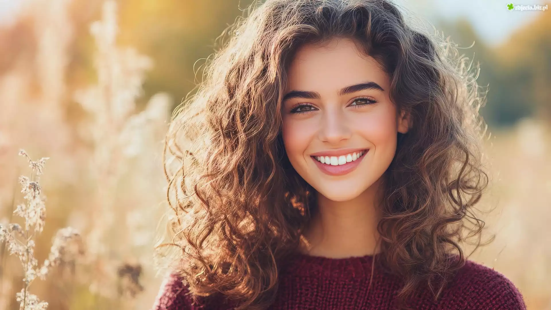 Zdjęcie Dziewczyna, Szatynka, Uśmiech, Kręcone, Włosy, Światło, Rośliny