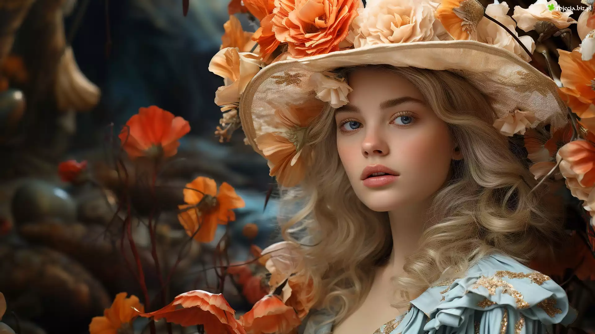 Zdjęcie Kobieta, Blondynka, Kapelusz, Kremowe, Pomarańczowe, Kwiaty