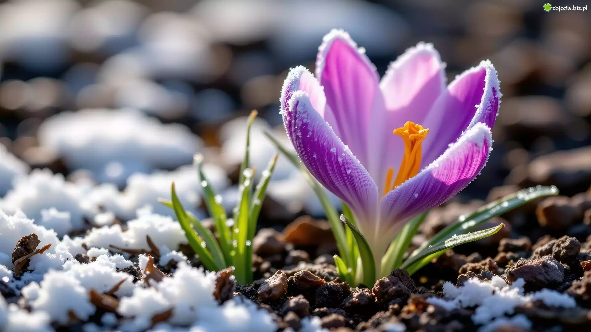 Zdjęcie Śnieg, Ośnieżony, Fioletowy, Krokus, Zielone, Listki