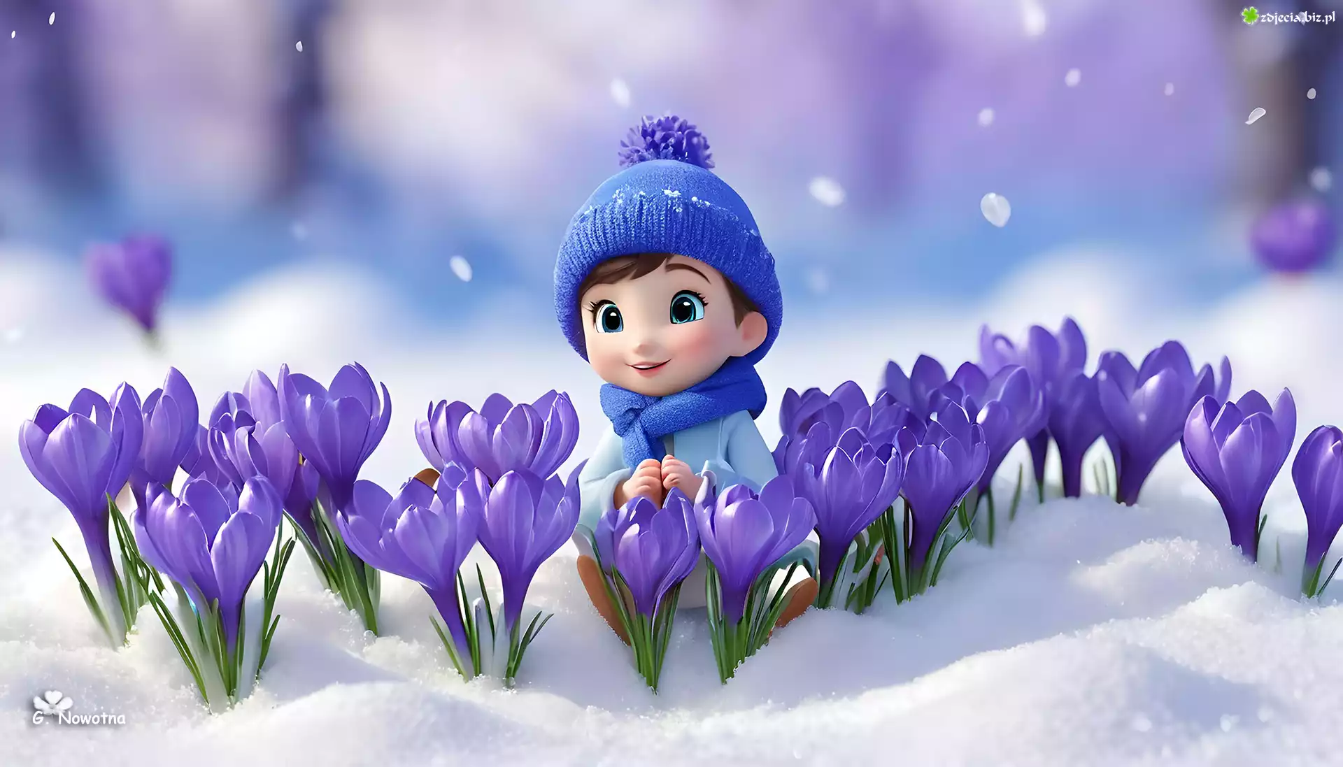 Zdjęcie Fioletowe, Krokusy, Chłopiec, Śnieg, Grafika