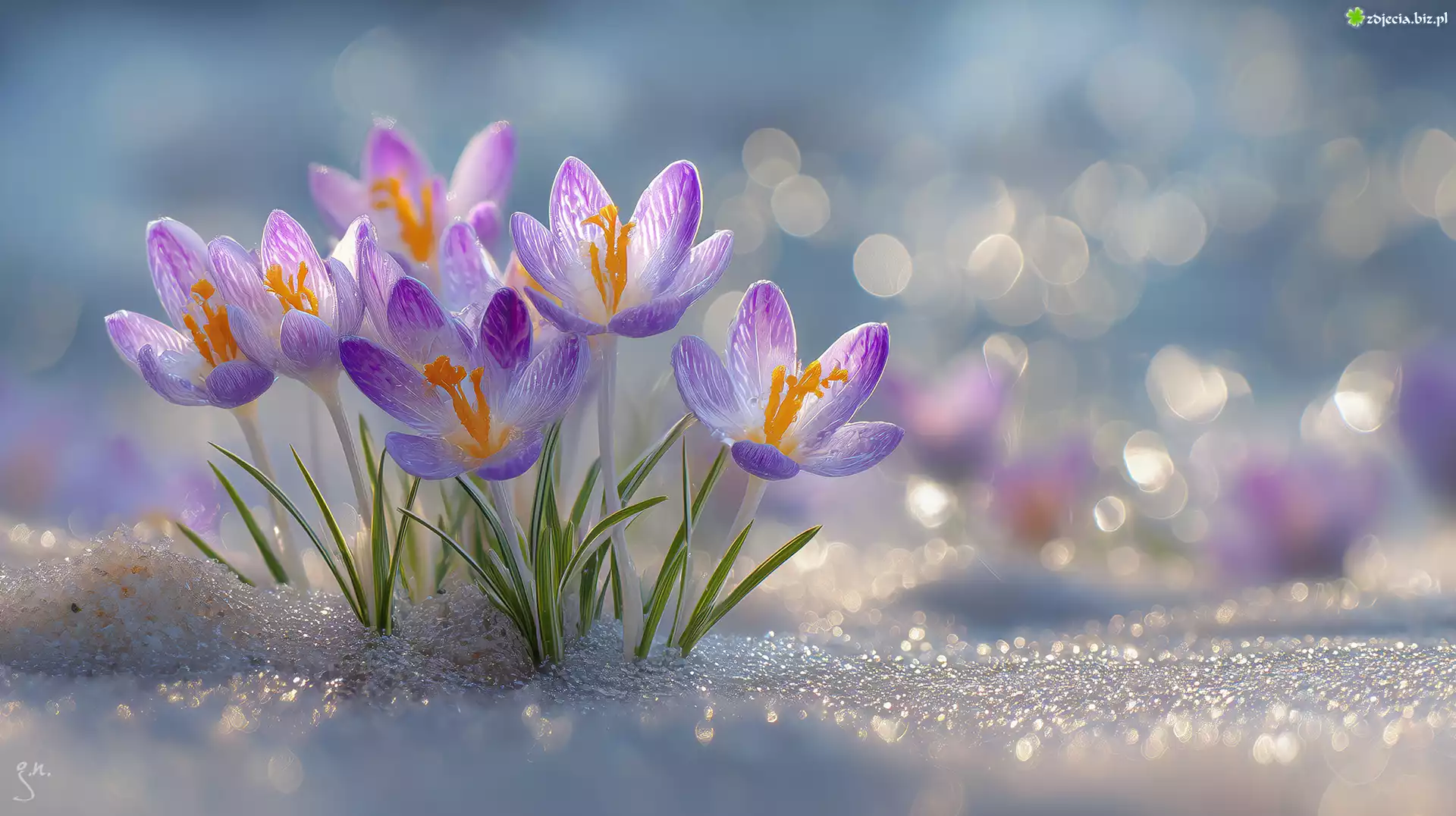 Zdjęcie Kwiaty, Kępka, Fioletowe, Krokusy, Śnieg, Grafika AI