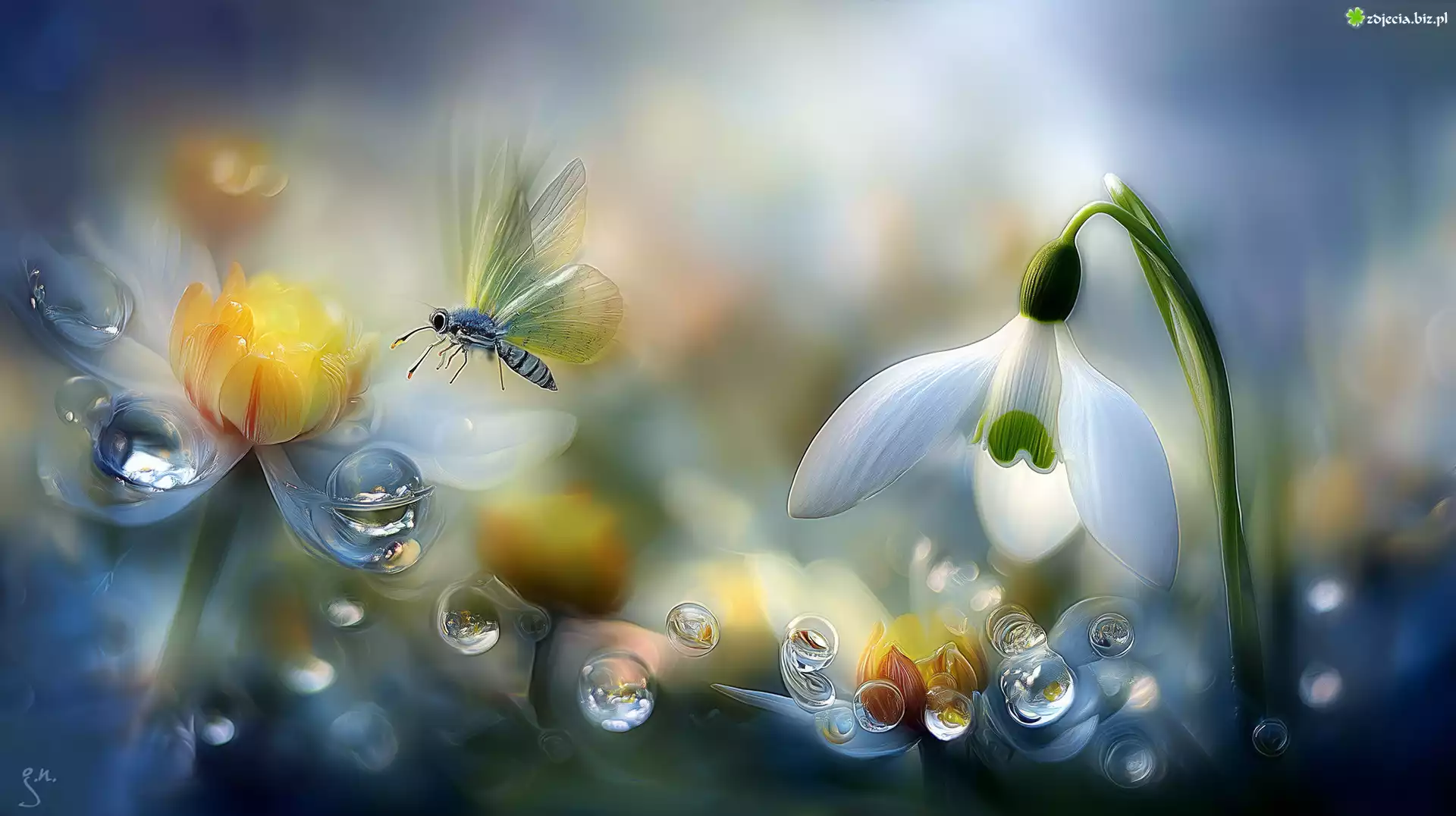 Zdjęcie Przebiśnieg, Kwiat, Motyl, Krople, Grafika AI