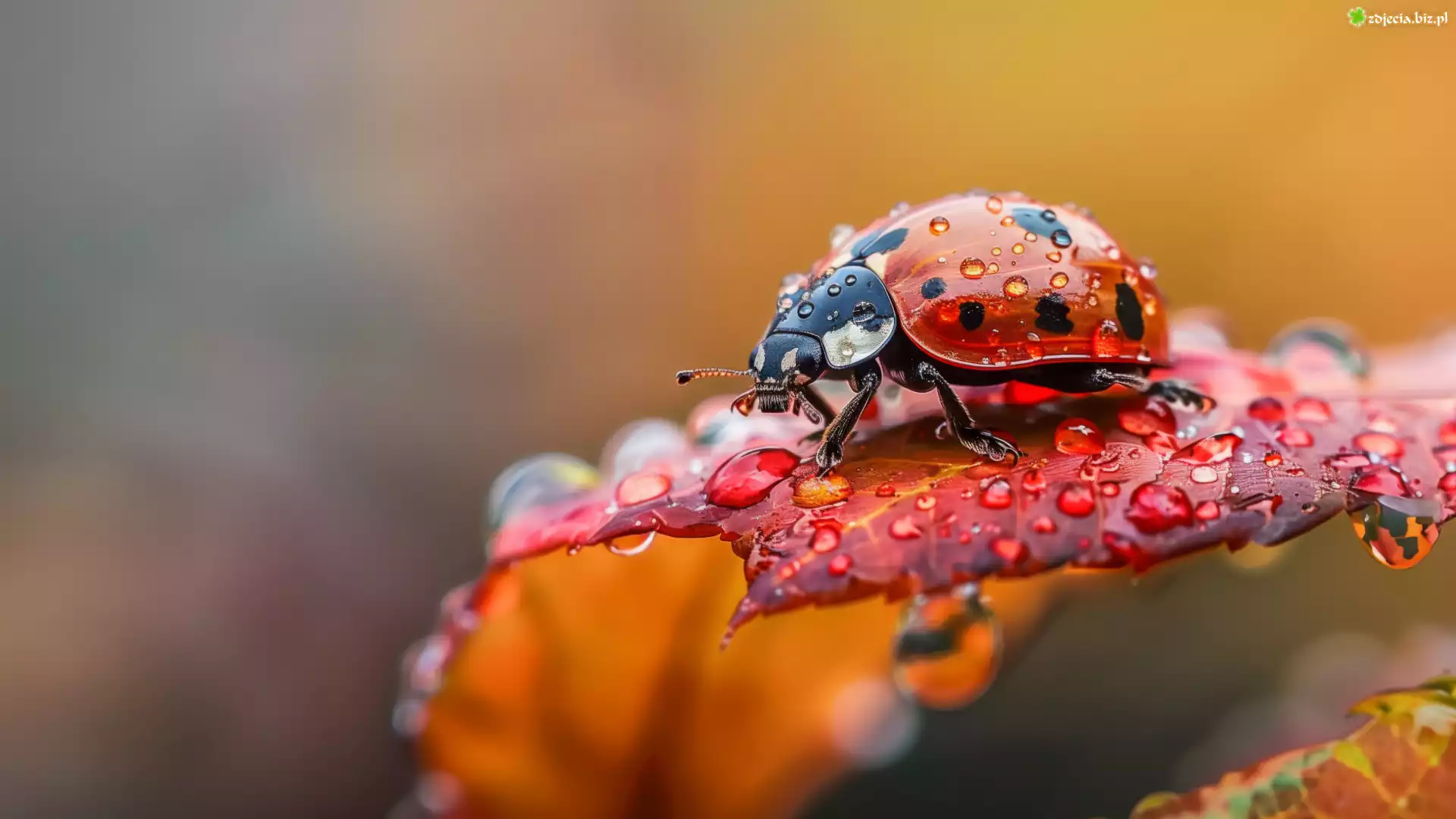 Zdjęcie Biedronka, Krople, Rosa, Liść, Makro