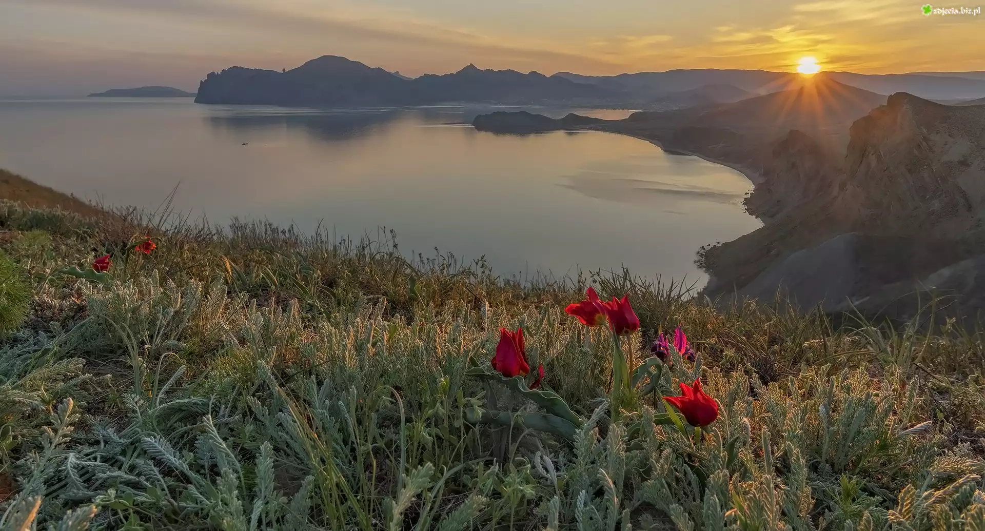 Zdjęcie Wschód słońca, Góry, Morze Czarne, Kwiaty, Tulipany, Trawa, Rośliny, Krym