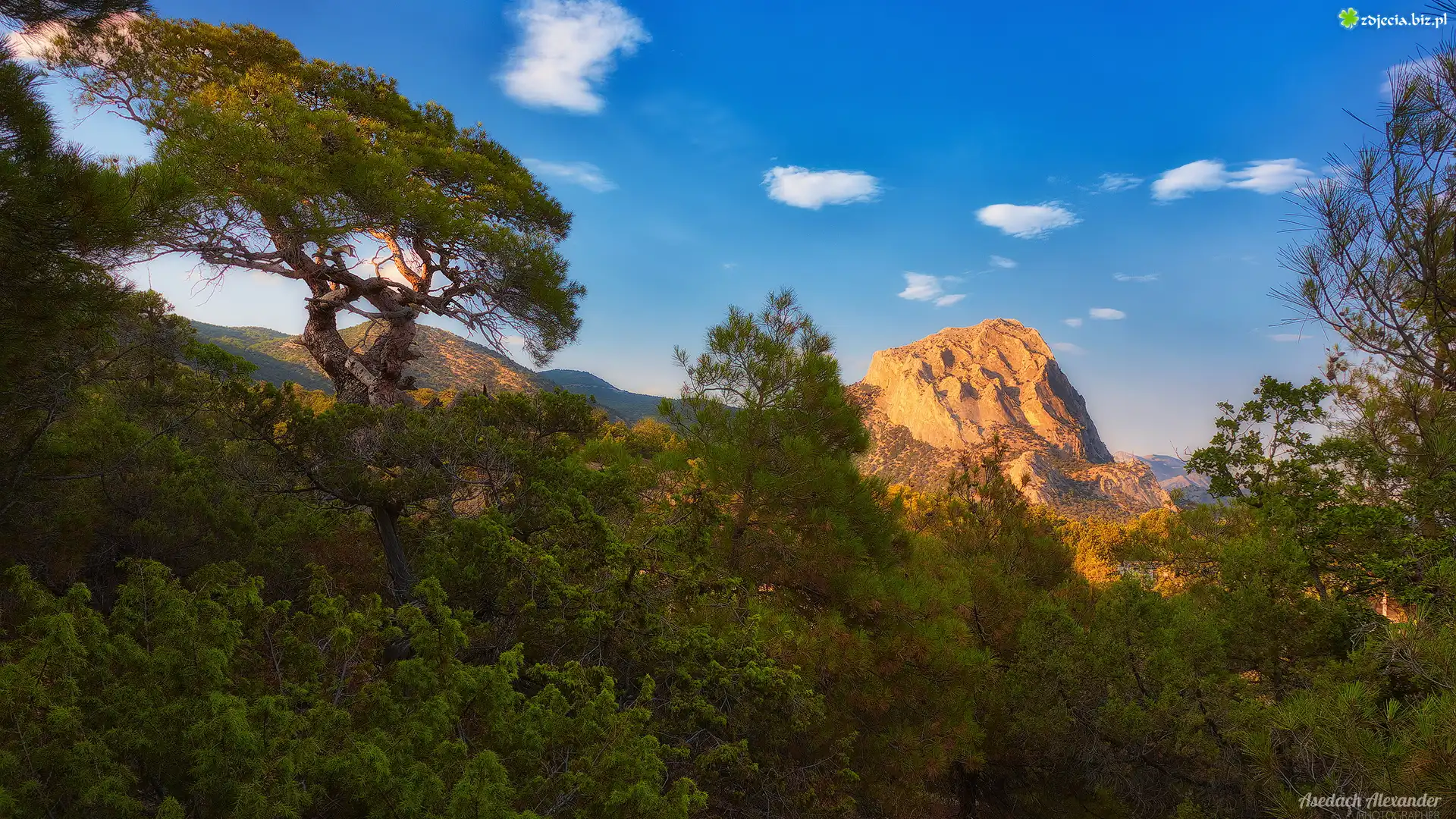 Zdjęcie Góry Krymskie, Rozświetlona, Góra, Sosny, Drzewa, Krym