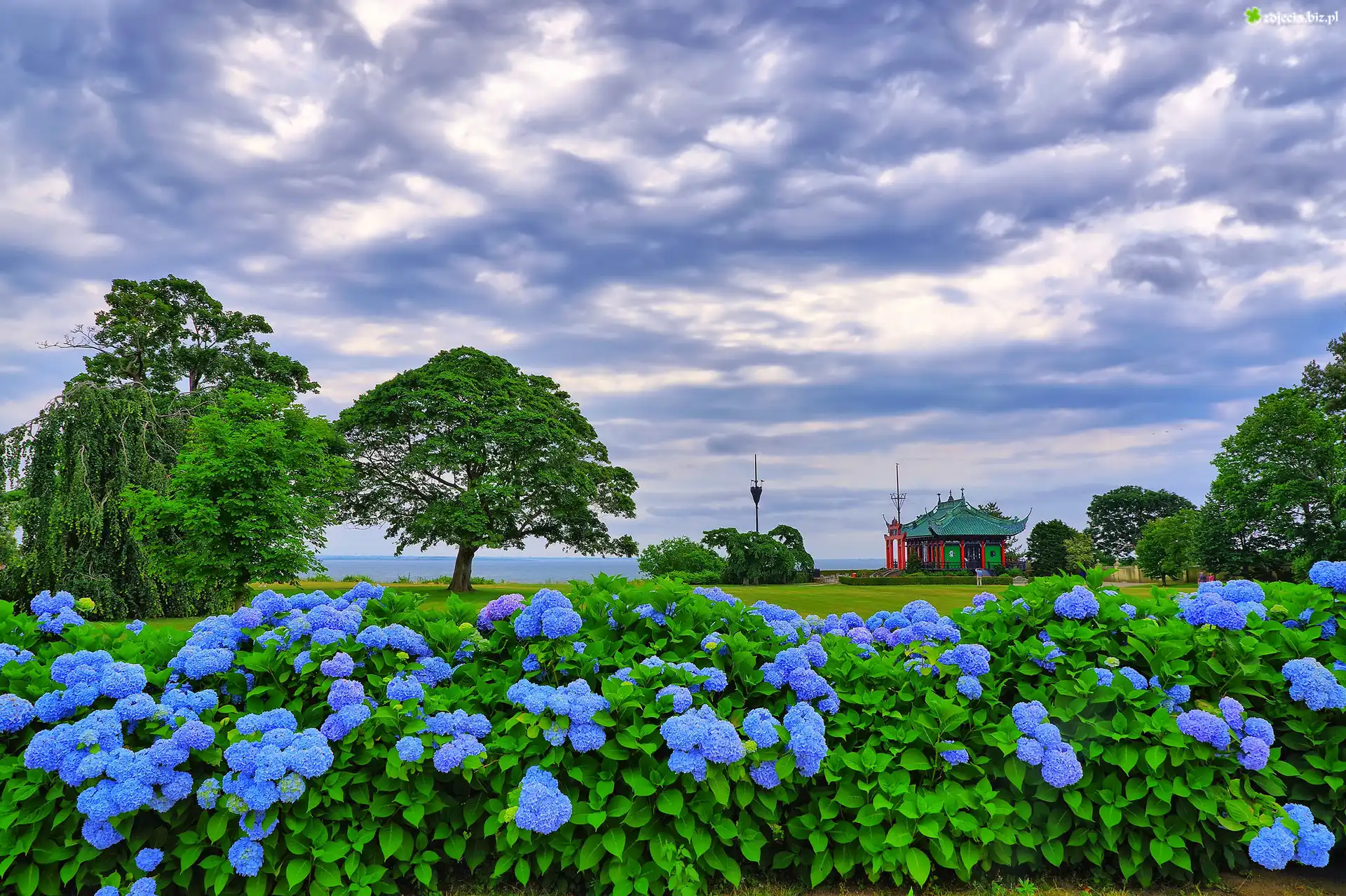 Zdjęcie Krzewy, Niebieskie, Hortensje, Drzewa, Dom, Chmury