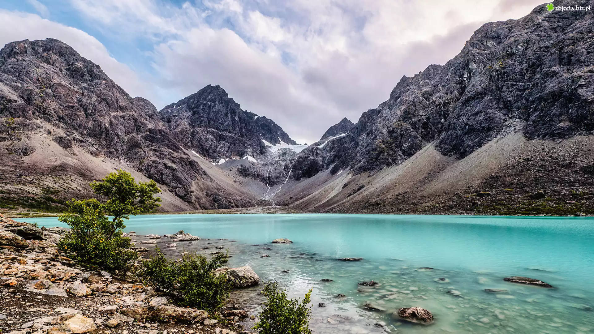 Zdjęcie Góry, Jezioro, Kamienie, Krzewy, Niebo, Białe, Chmury
