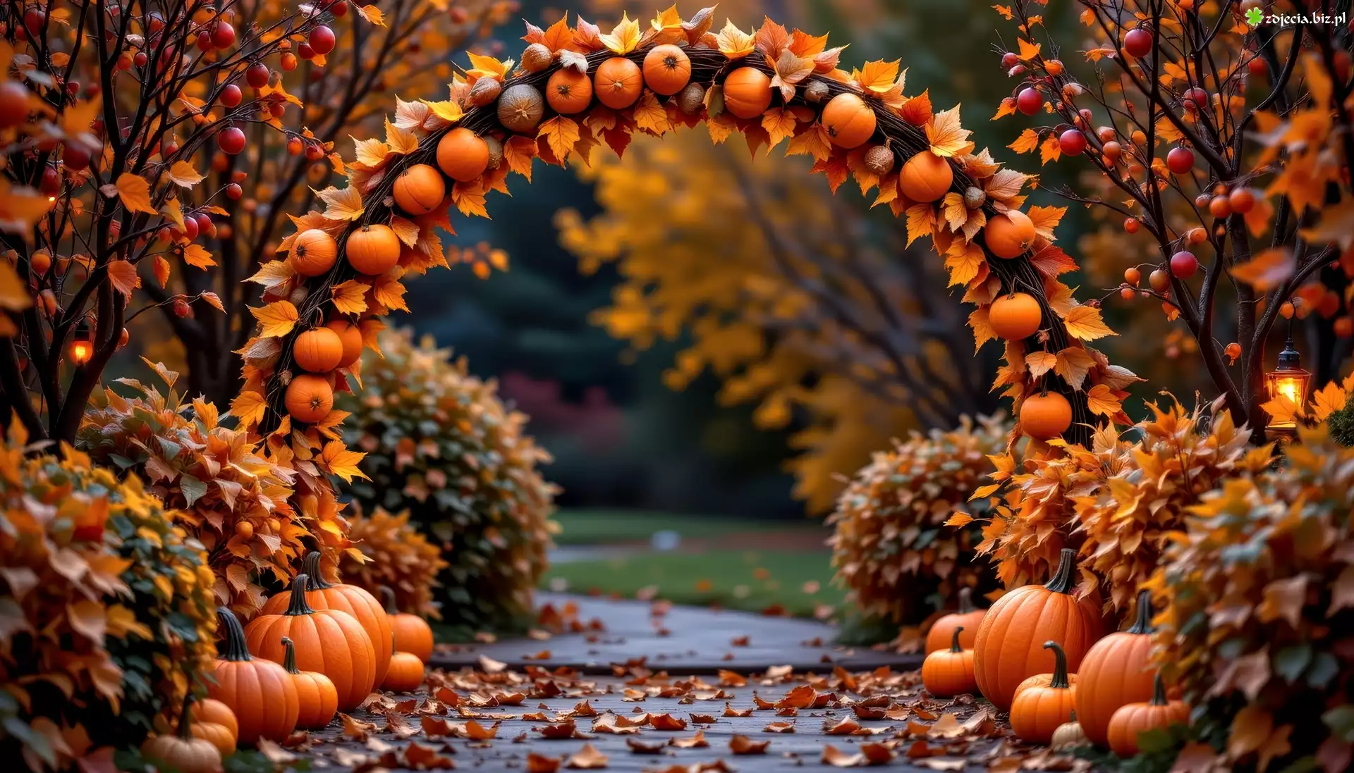 Zdjęcie Dynie, Łuk, Liście, Krzewy, Jesień, Grafika AI