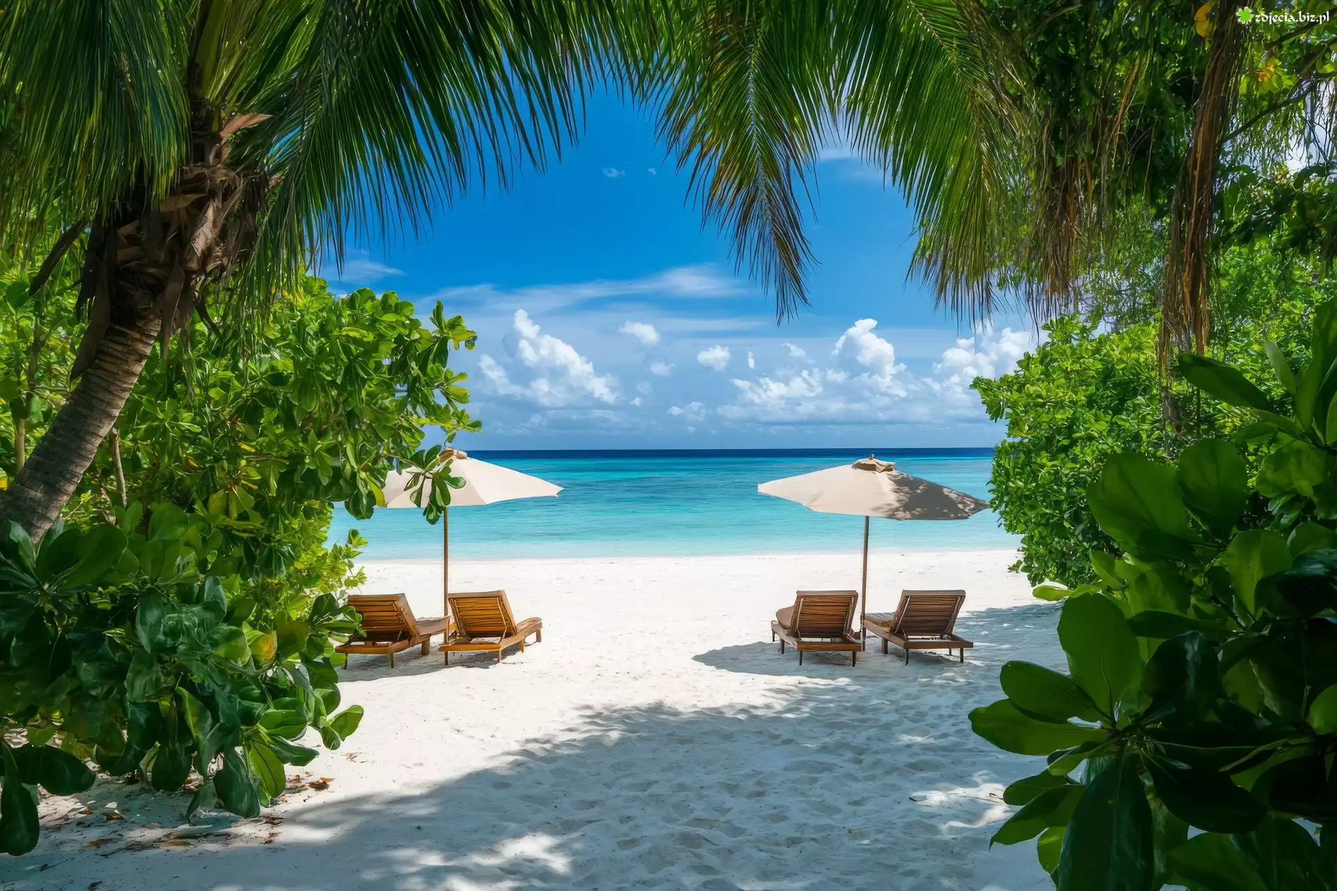 Zdjęcie Morze, Plaża, Palmy, Krzewy, Rośliny, Leżaki, Parasole