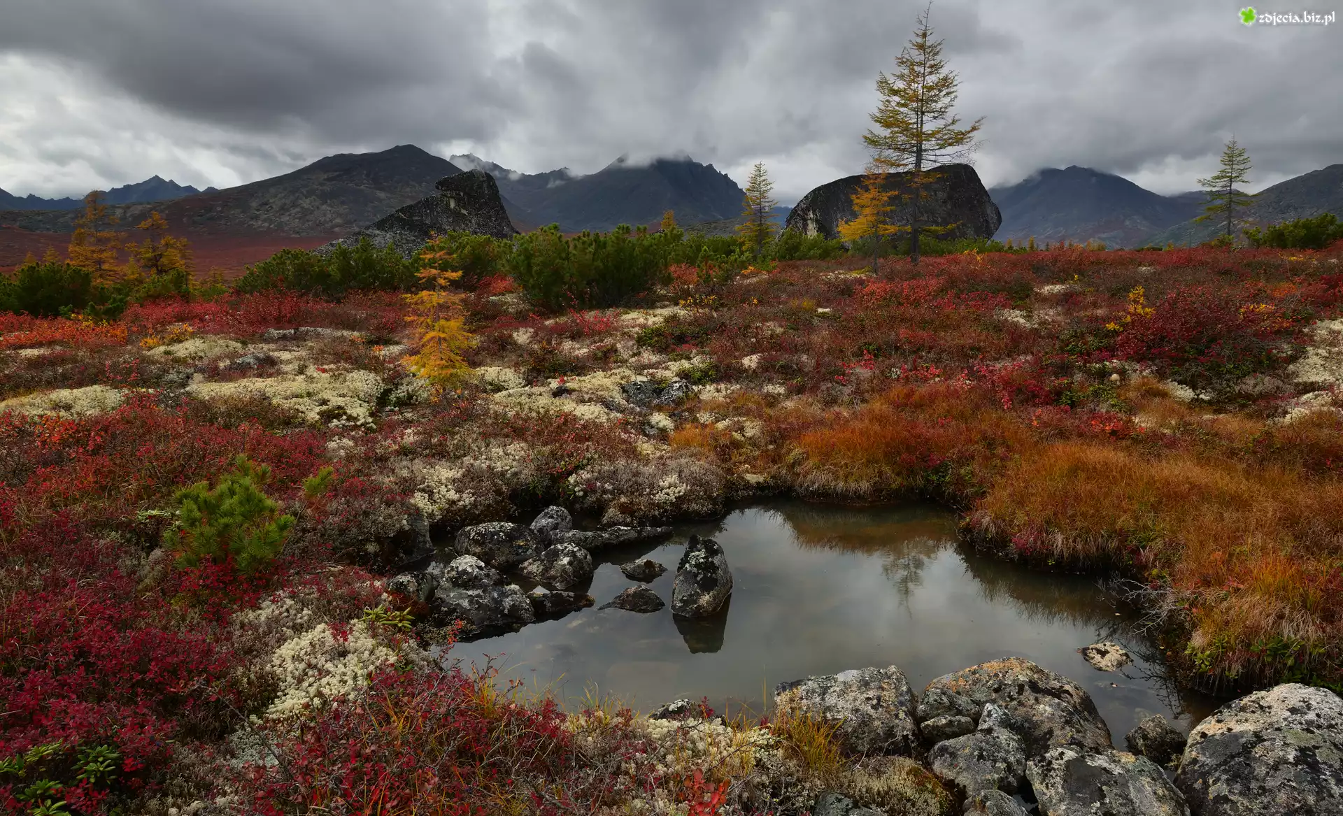 Zdjęcie Rośliny, Drzewa, Krzewy, Kamienie, Skały, Góry Kołymskie, Kołyma, Obwód magadański, Rosja