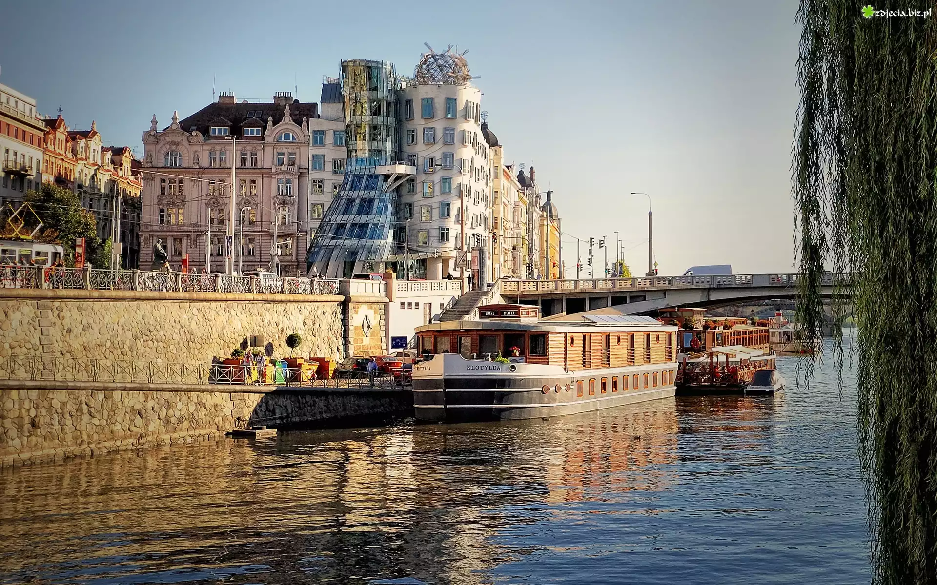 Zdjęcie Krzywe, Domy, Praga, Rzeka, Most, Barki