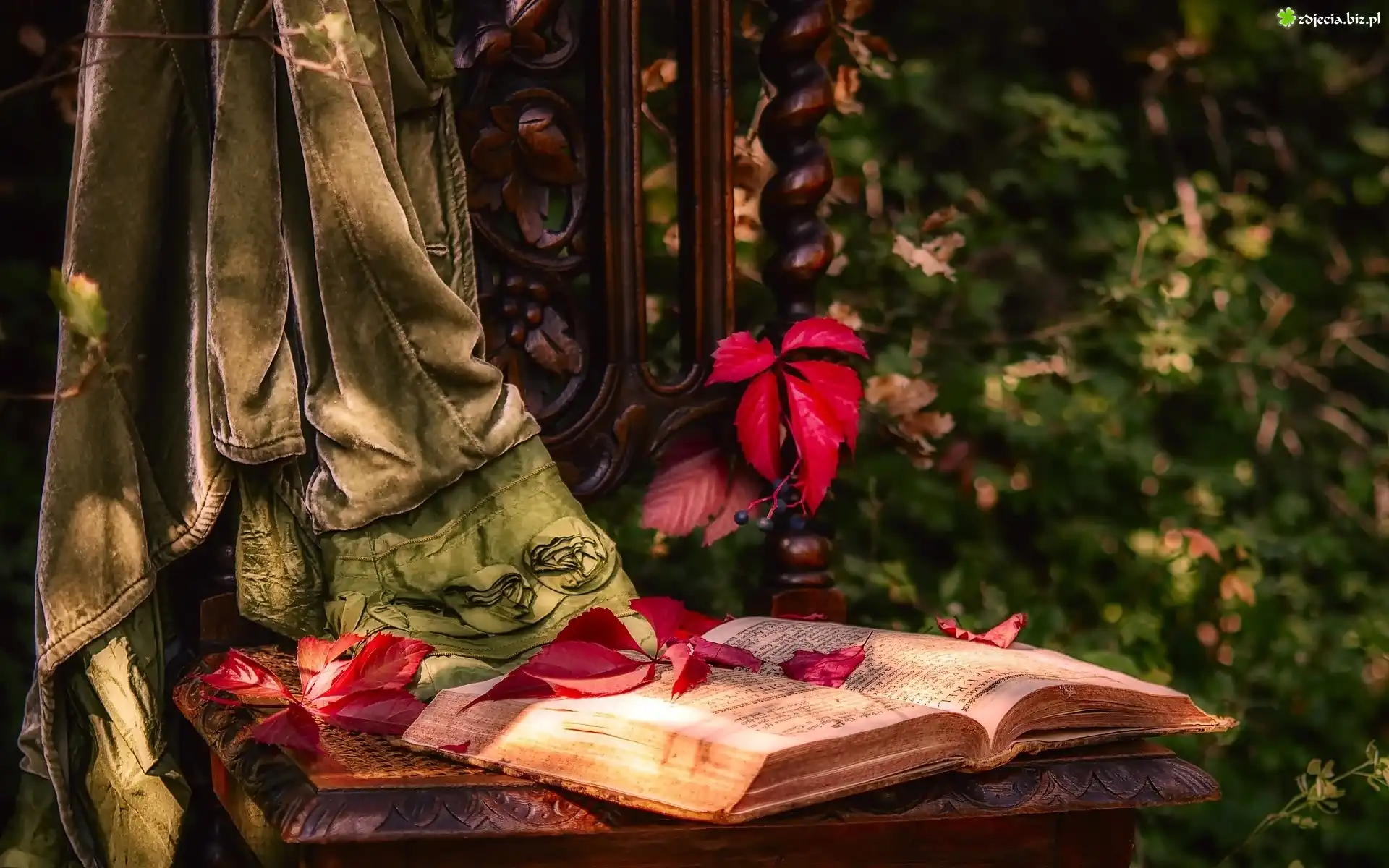 Zdjęcie Książka, Liście, Krzesło, Drzewa, Dekoracja, Ogród