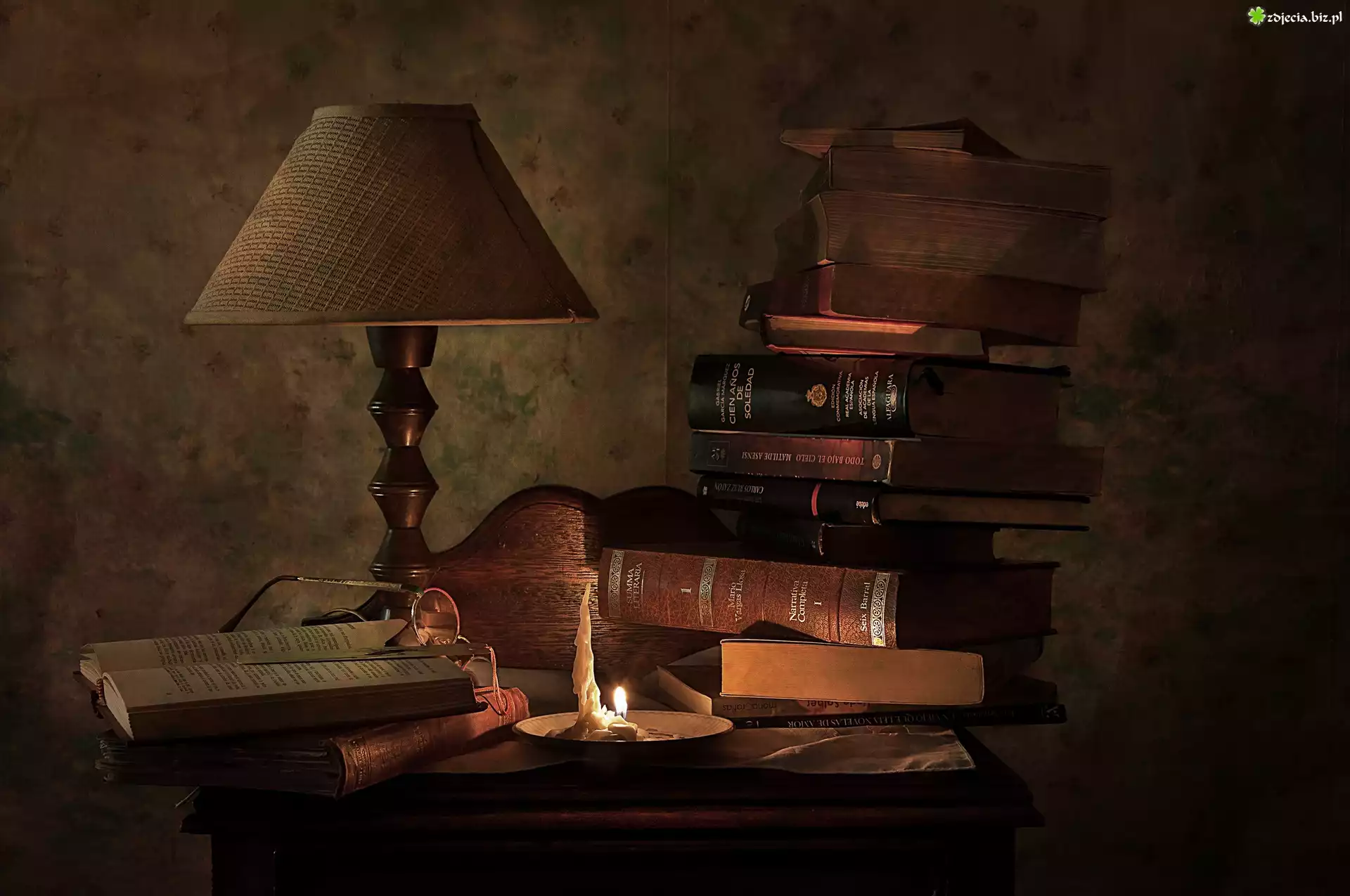 Zdjęcie, Książki, Sterta, Lampa, Świeczka, Okulary