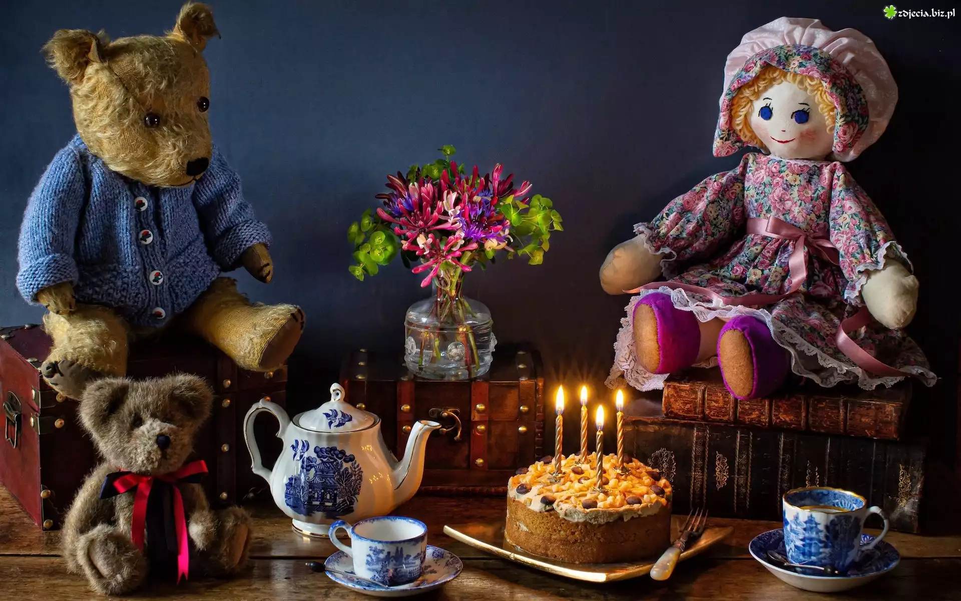 Zdjęcie, Kompozycja, Misie, Lalka, Tort, Świeczki, Bukiet kwiatów, Serwis kawowy, Książki