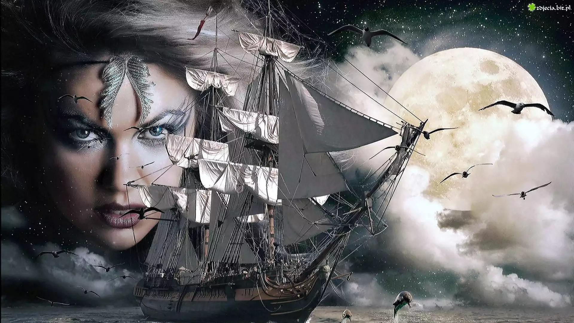 Zdjęcie Fantasy, Księżyc, Morze, Ptaki, Twarz, Kobieta, Żaglowiec