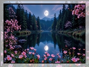 Zdjęcie, Góry, Jezioro, Kwiaty, Księżyc, Drzewa, Odbicie