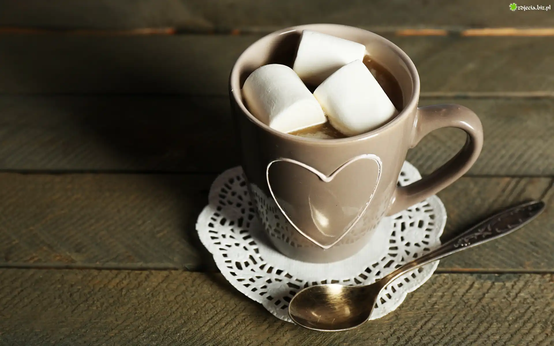 Zdjęcie Kawa, Kubek, Serce, Łyżeczka, Pianki, Serwetka, Deski