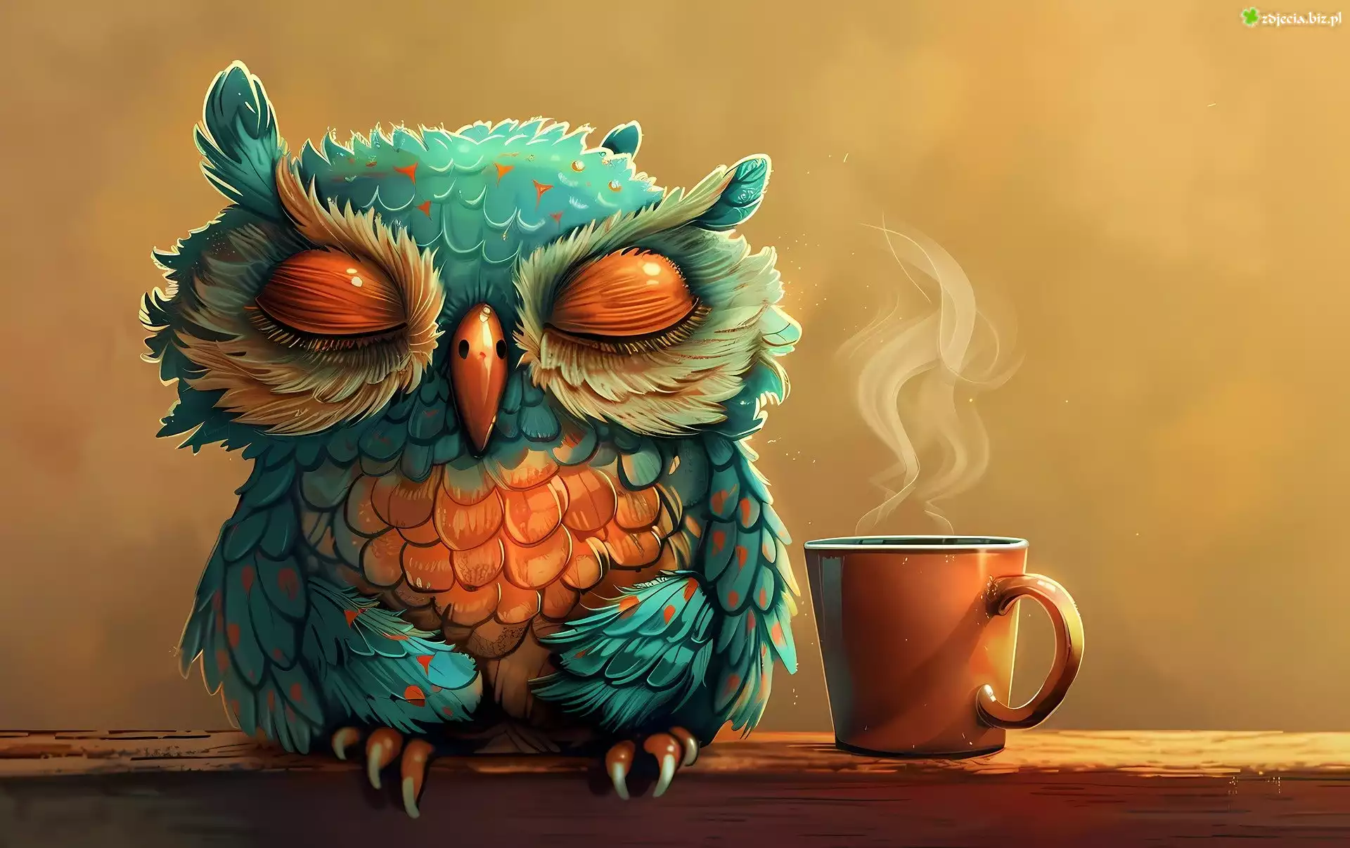 Zdjęcie Sowa, Kubek, Kawa, Deska, Grafika