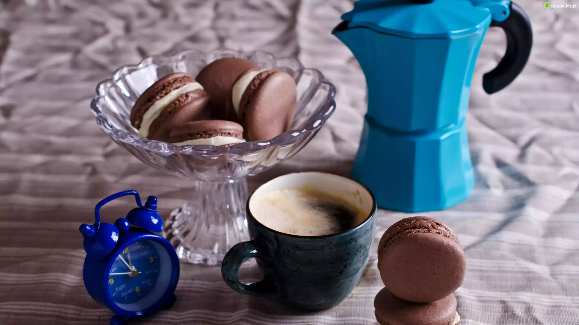 Zdjęcie Kawa, Kubek, Ciasteczka, Makaroniki, Budzik, Patera, Kawiarka