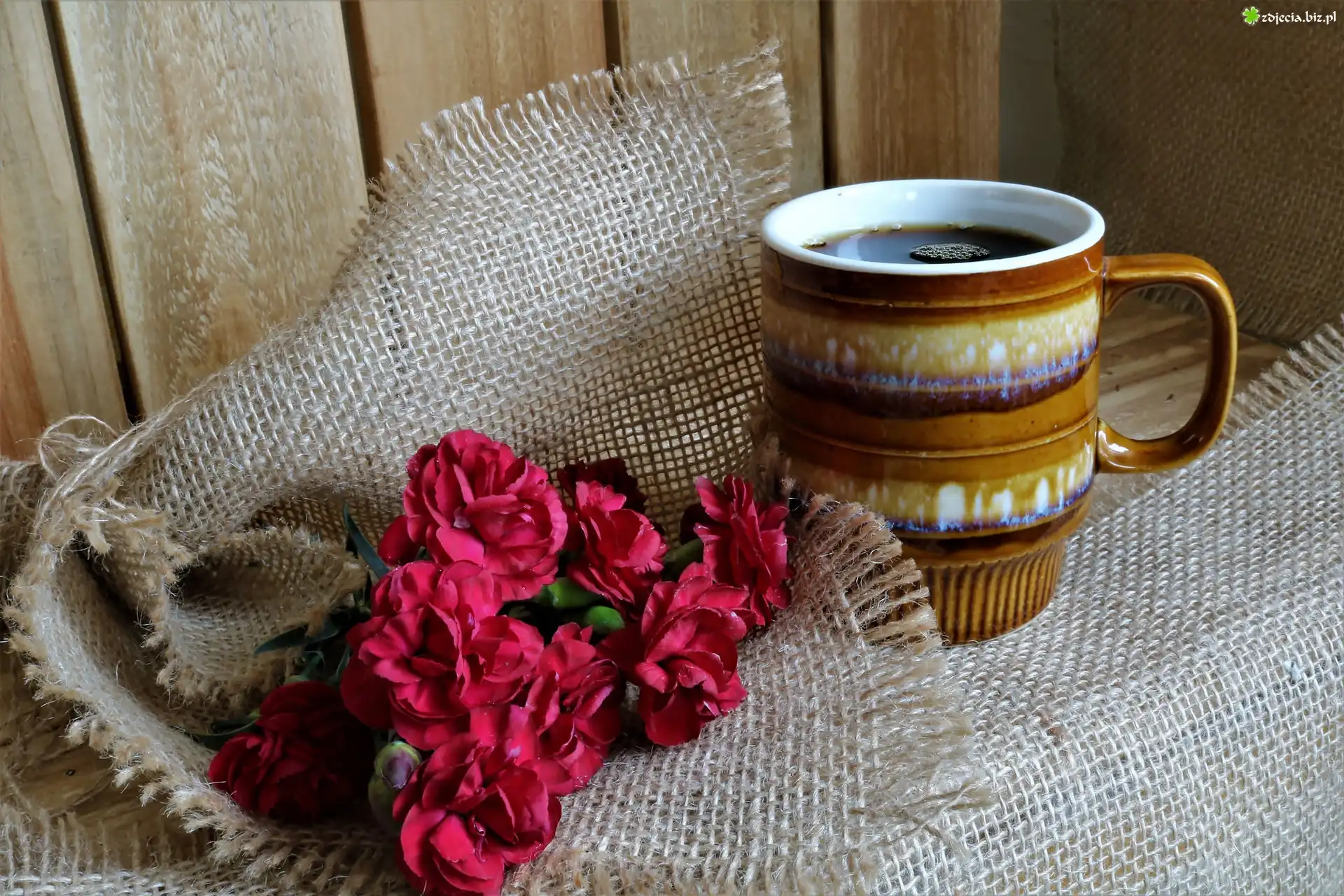 Zdjęcie Kubek, Kawa, Serwetka, Kwiatki, Goździki
