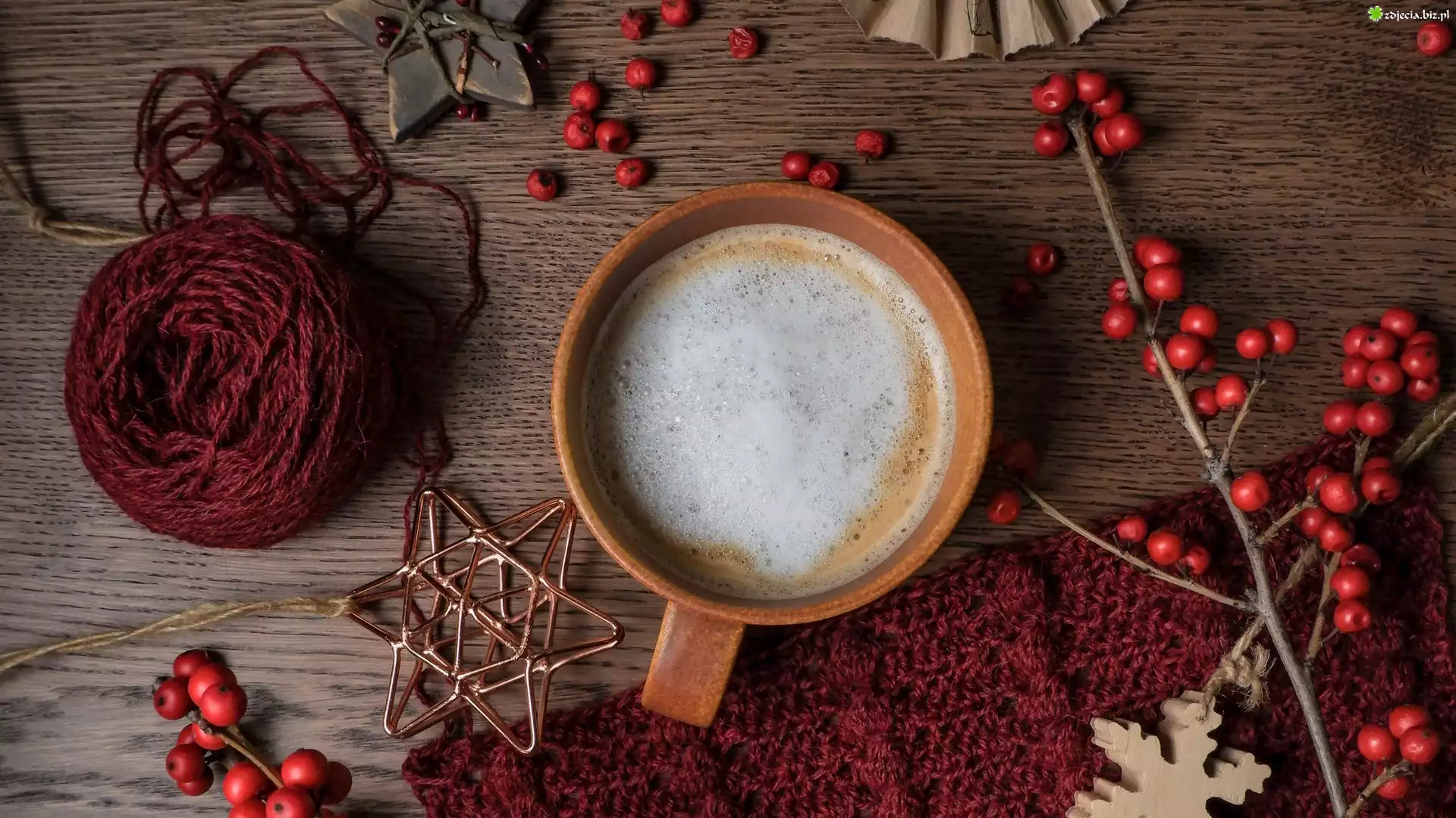 Zdjęcie Kubek, Kawa, Gałązki, Wełna, Gwiazdki