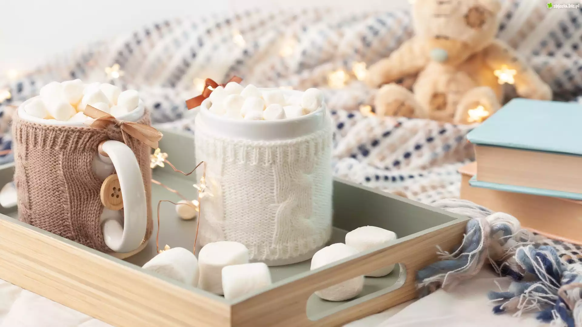 Zdjęcie, Kubki, Osłonki, Dzianina, Pianki, Taca, Książki, Świąteczne