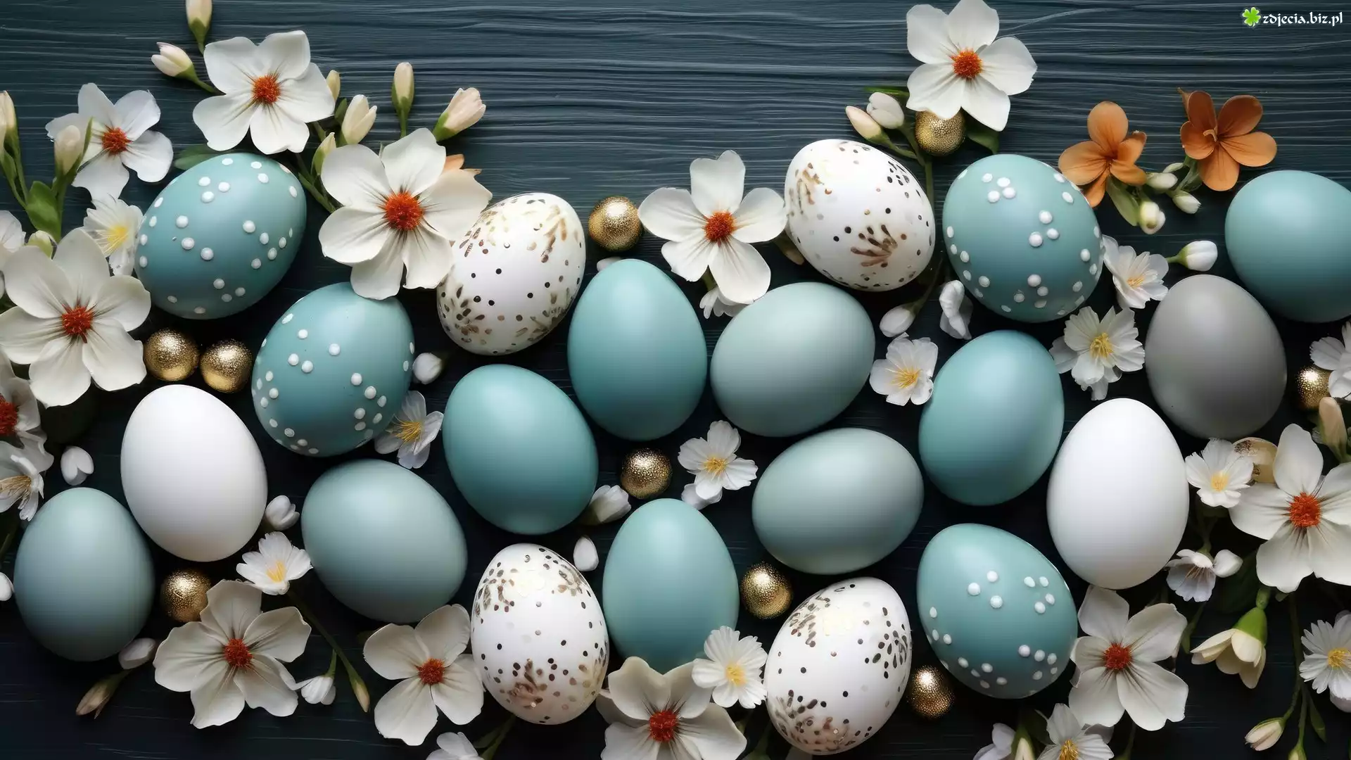 Zdjęcie Wielkanoc, Niebieskie, Białe, Pisanki, Białe, Kwiaty, Złote, Kulki