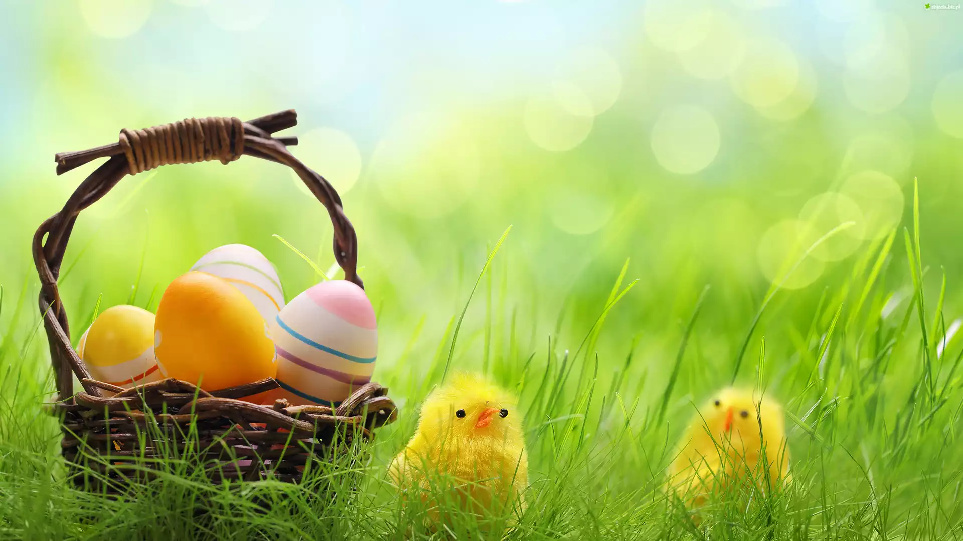 Zdjęcie Wielkanoc, Koszyk, Jajka, Kolorowe, Pisanki, Trawa, Dwa, Kurczaki