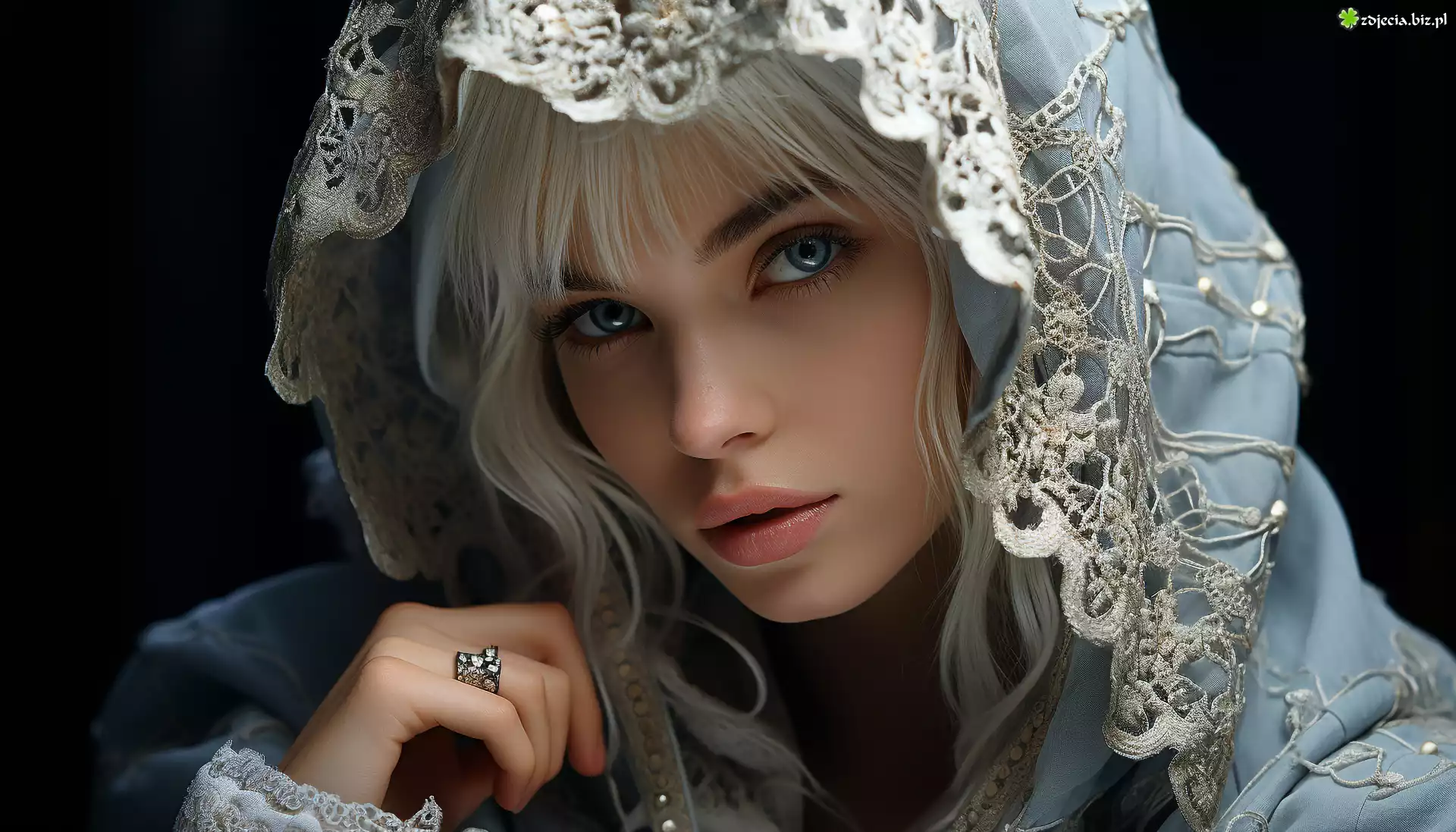 Zdjęcie Kobieta, Blondynka, Makijaż, Kurtka, Kaptur, Spojrzenie, Grafika