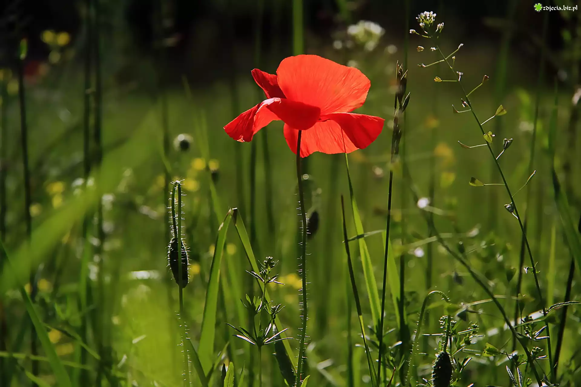 Zdjęcie Kwiat, Jeden, Czerwony, Mak, Trawa