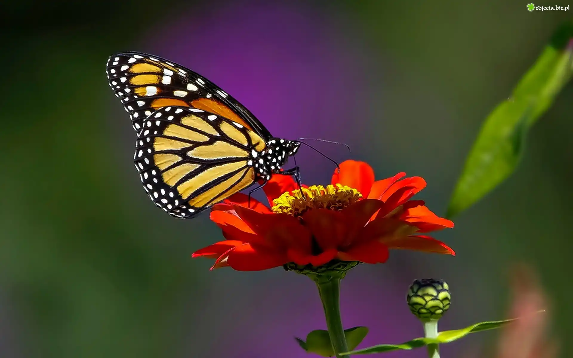 Zdjęcie Motyl, Monarcha, Kwiatek, Cynia