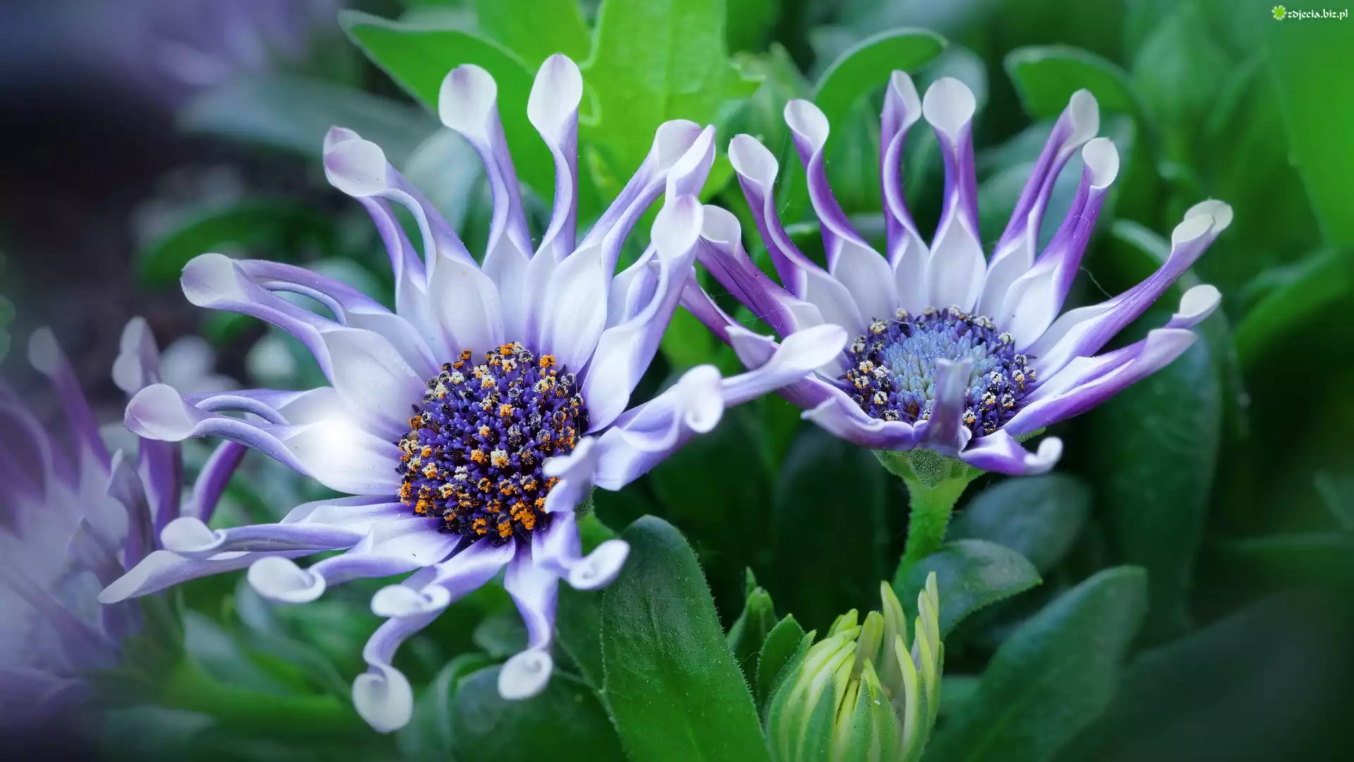 Zdjęcie, Kwiaty, Biało-fioletowe, Stokrotki afrykańskie, Liście