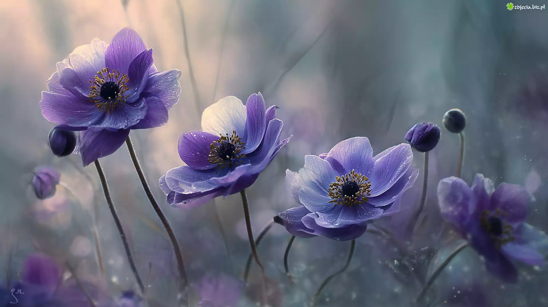 Zdjęcie Anemony, Zawilce, Fioletowe, Kwiaty, Grafika AI