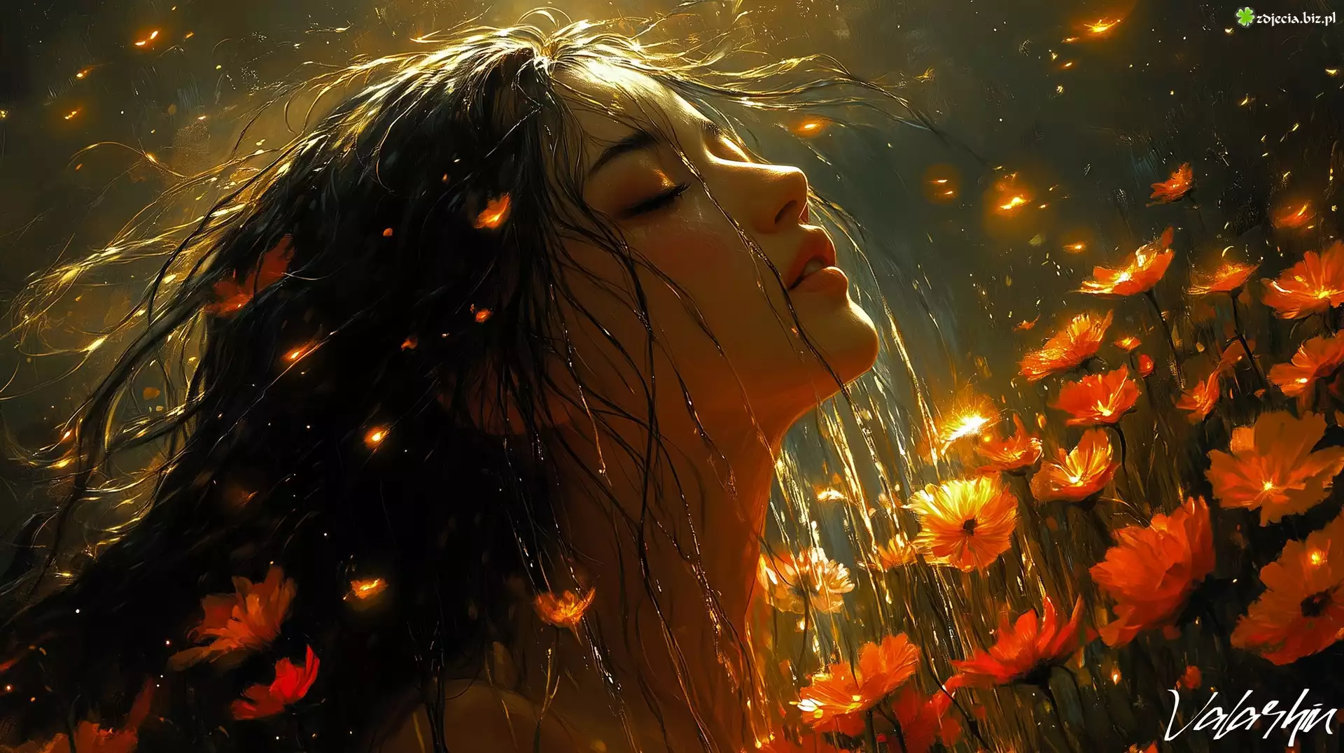 Zdjęcie, Dziewczyna, Twarz, Włosy, Kwiaty, Grafika AI