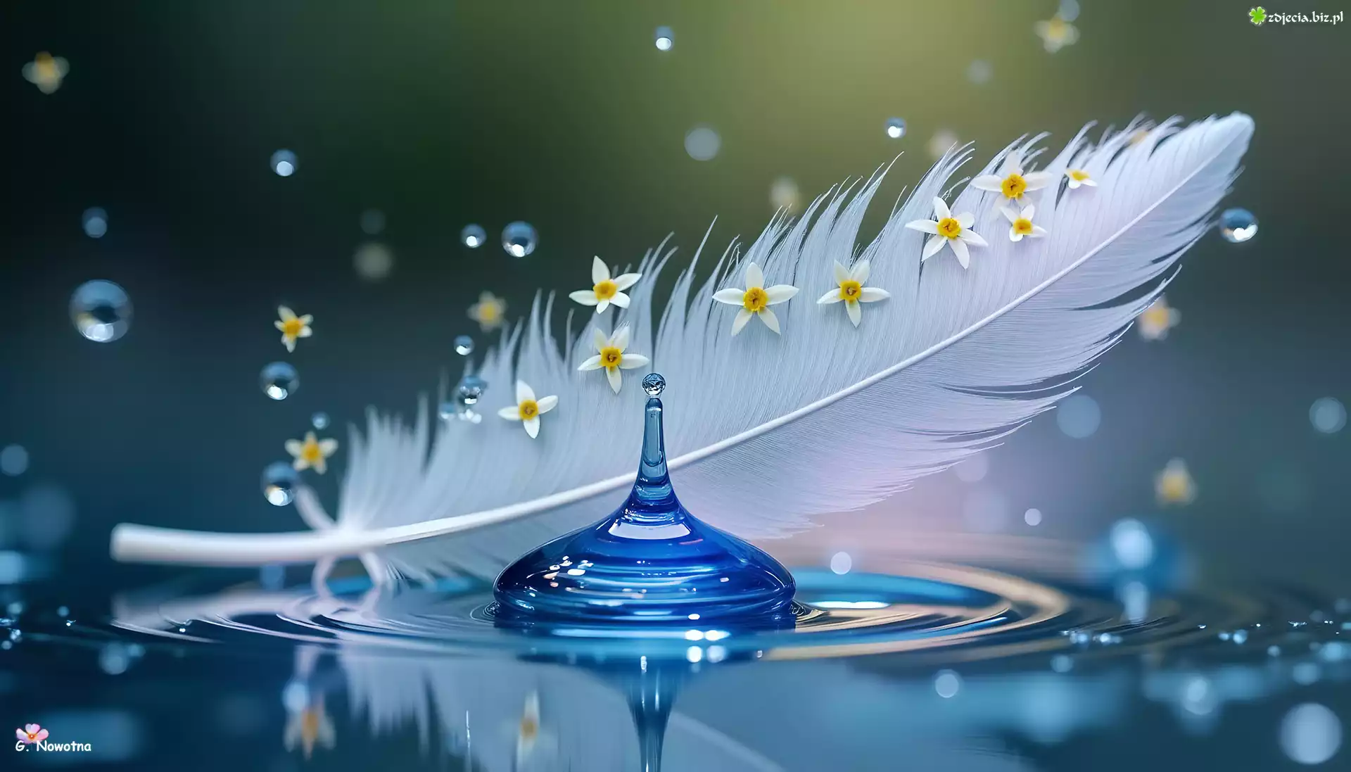 Zdjęcie Piórko, Kropla, Woda, Kwiaty, Grafika AI