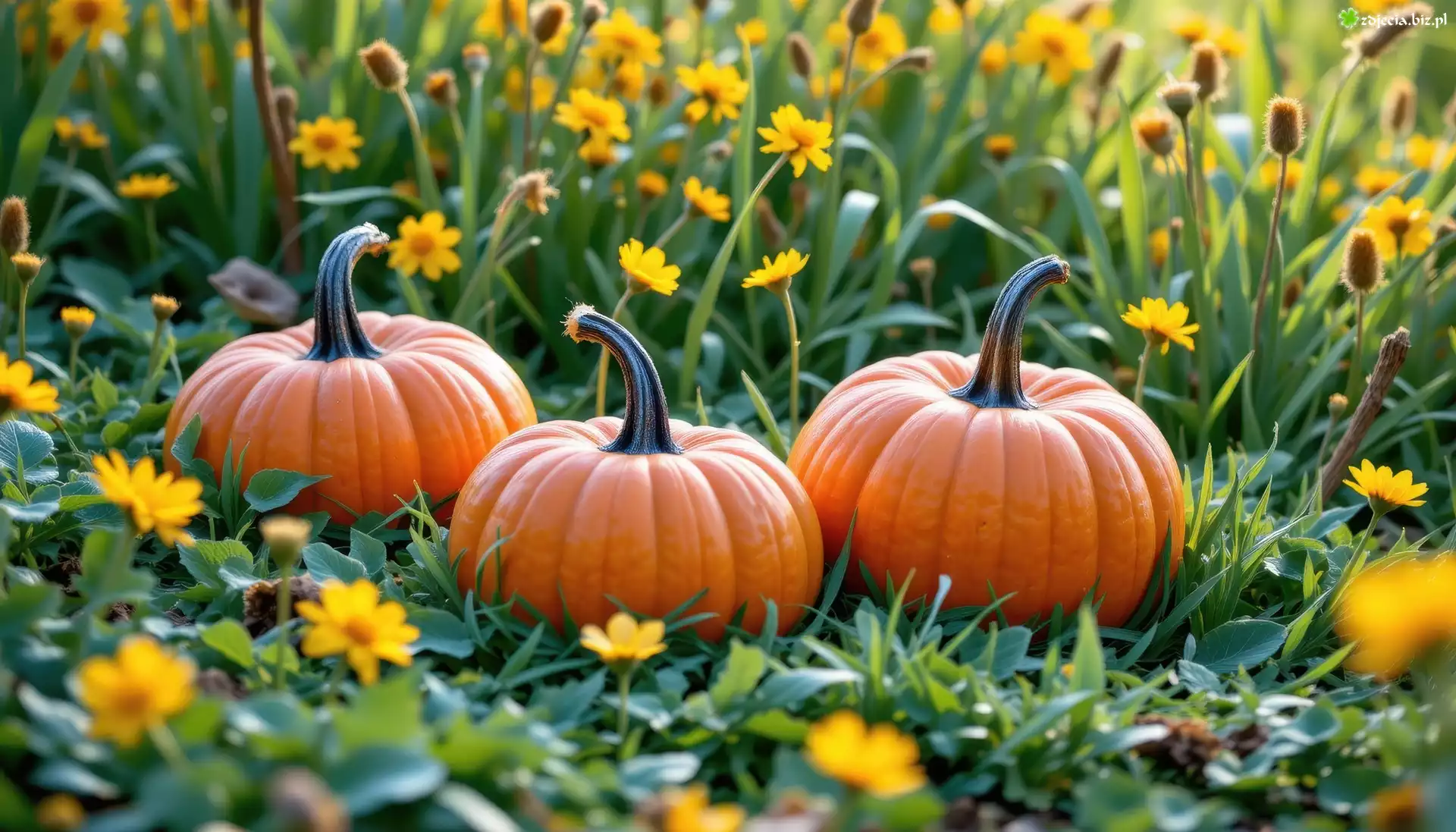 Zdjęcie Trzy, Dynie, Żółte, Kwiaty, Grafika AI