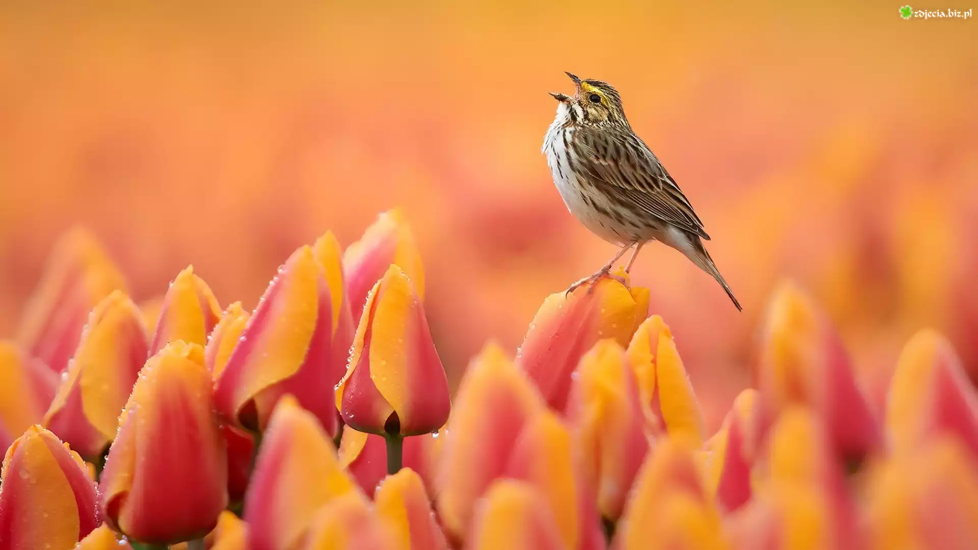 Zdjęcie Kwiaty, Pomarańczowe, Tulipany, Ptak, Bagiennik żółtobrewy