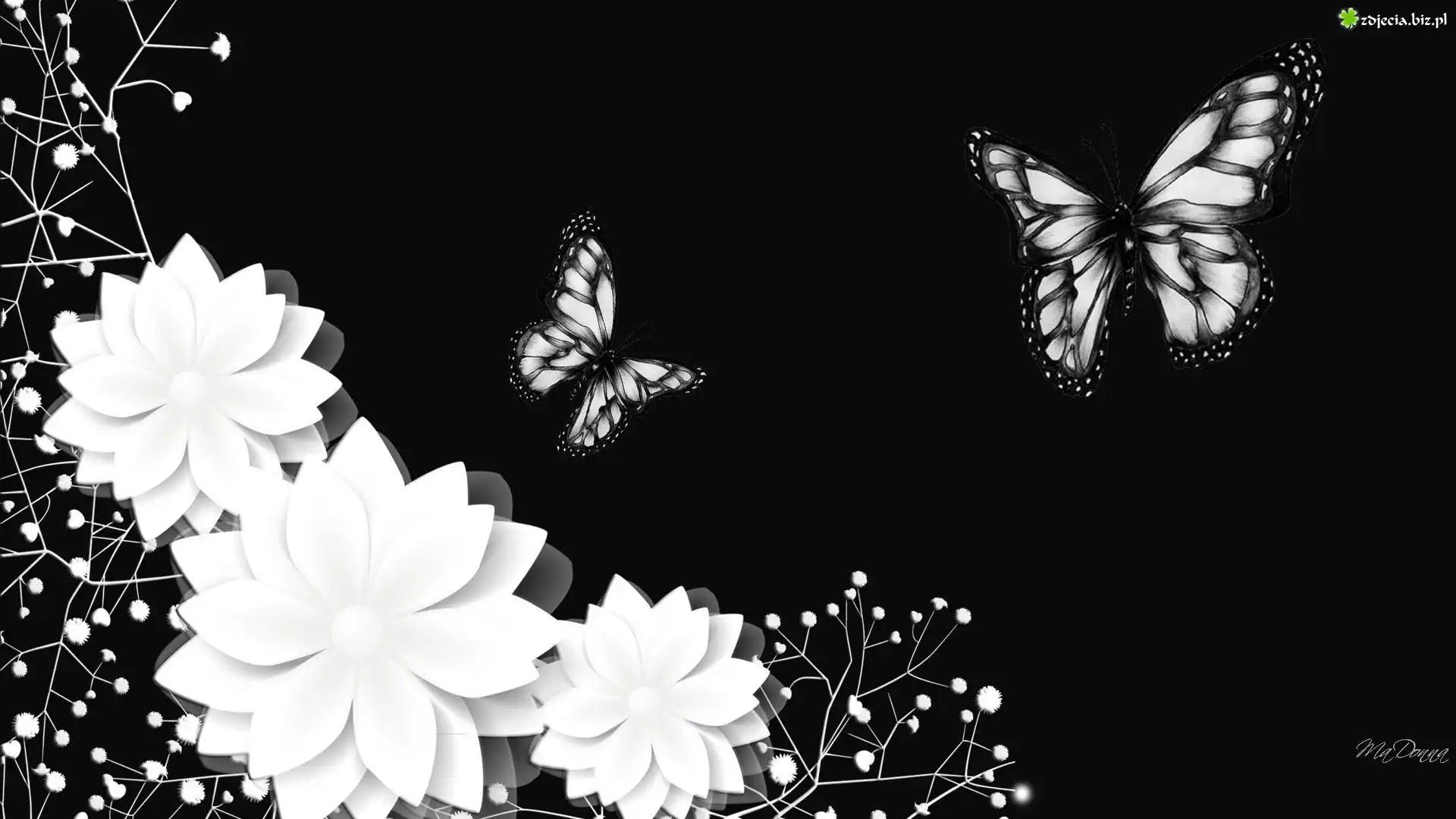 Zdjęcie Białe, Kwiaty, Gipsówka, Motyle, Czarne, Tło, 2D
