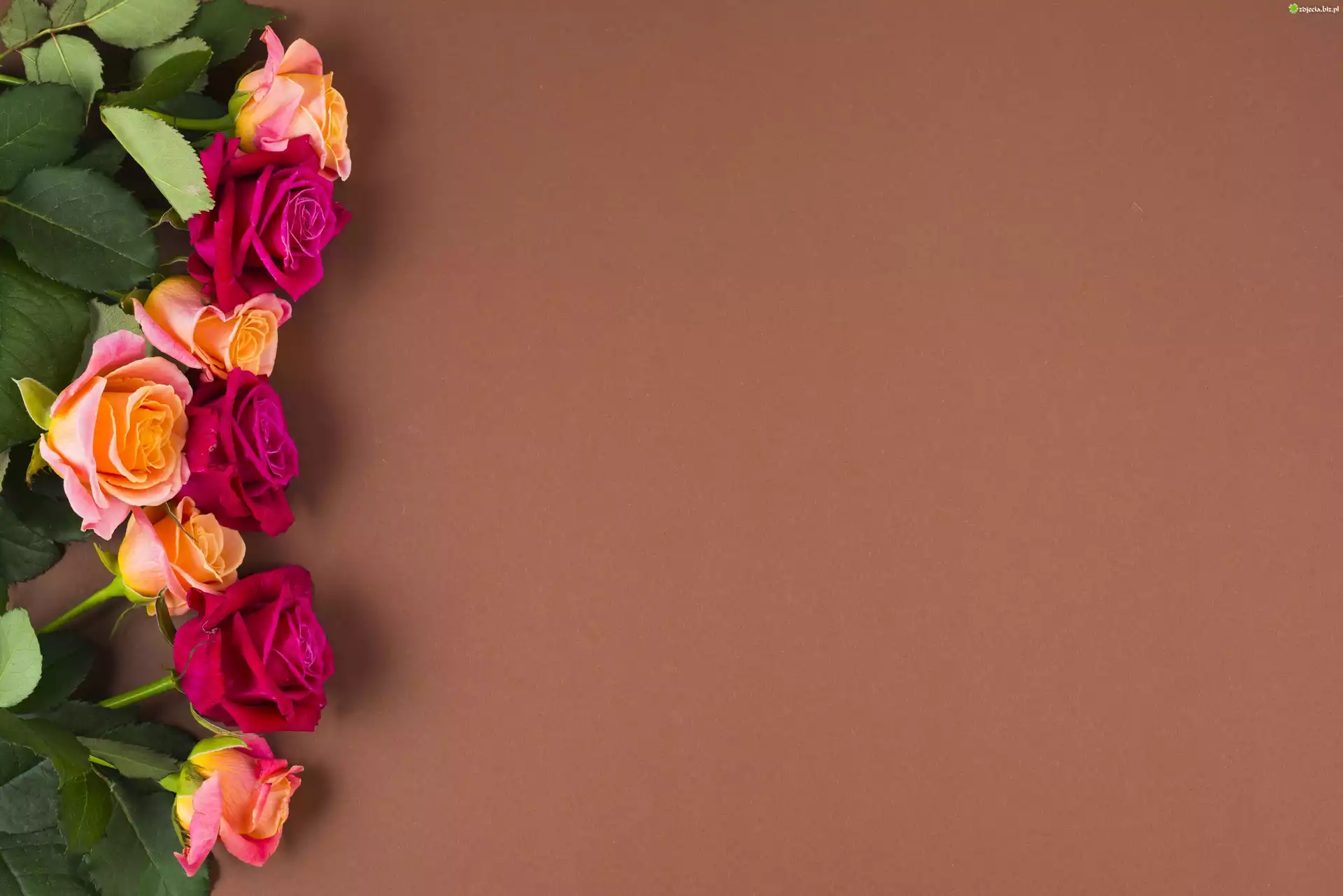 Zdjęcie Kwiaty, Kolorowe, Róże, Liście, Brązowe, Tło