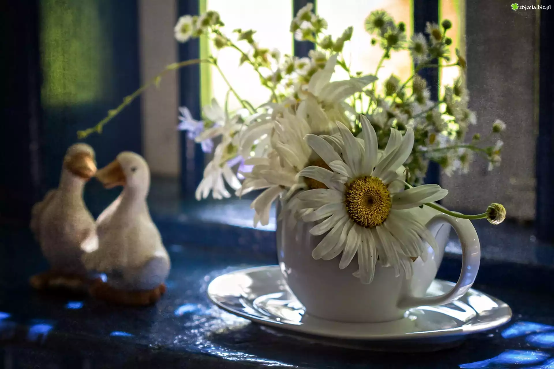 Zdjęcie Bukiet, Kwiaty, Rumianki, Filiżanka, Talerzyk, Figurki, Kaczki