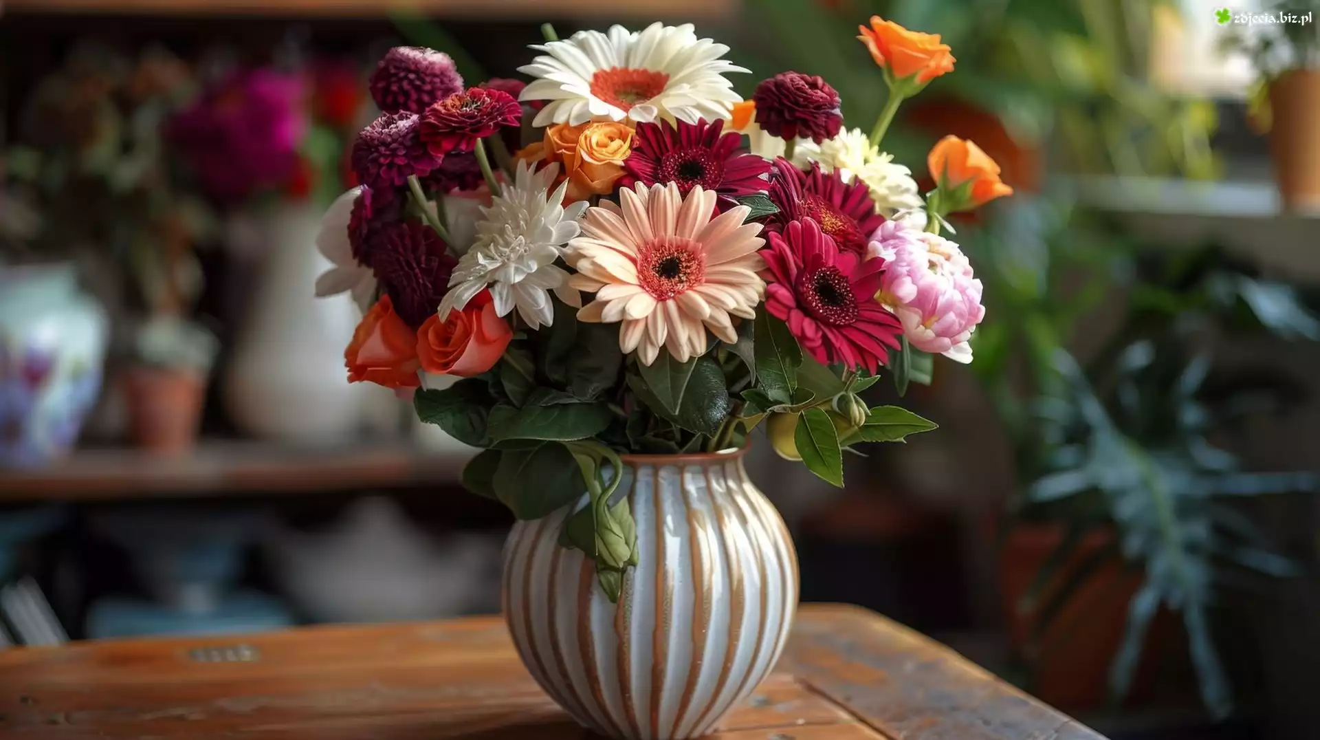 Zdjęcie Różnokolorowe, Kwiaty, Bukiet, Wazon, Stół