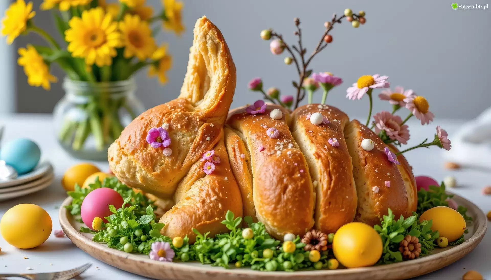 Zdjęcie Wielkanoc, Królik, Chleb, Kwiaty, Jajka, Taca, Stół