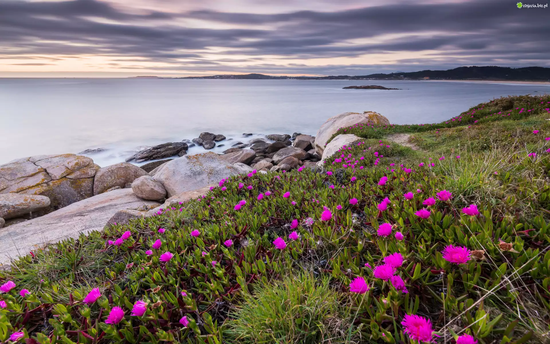 Zdjęcie Różowe, Kwiaty, Skały, Kamienie, Wybrzeże, Morze, Niebo, Chmury